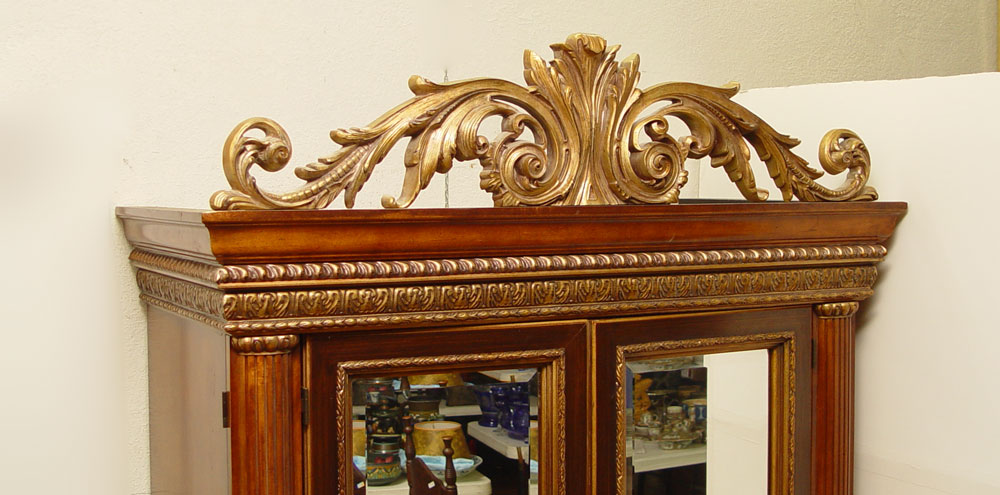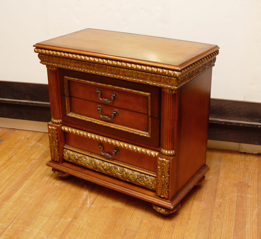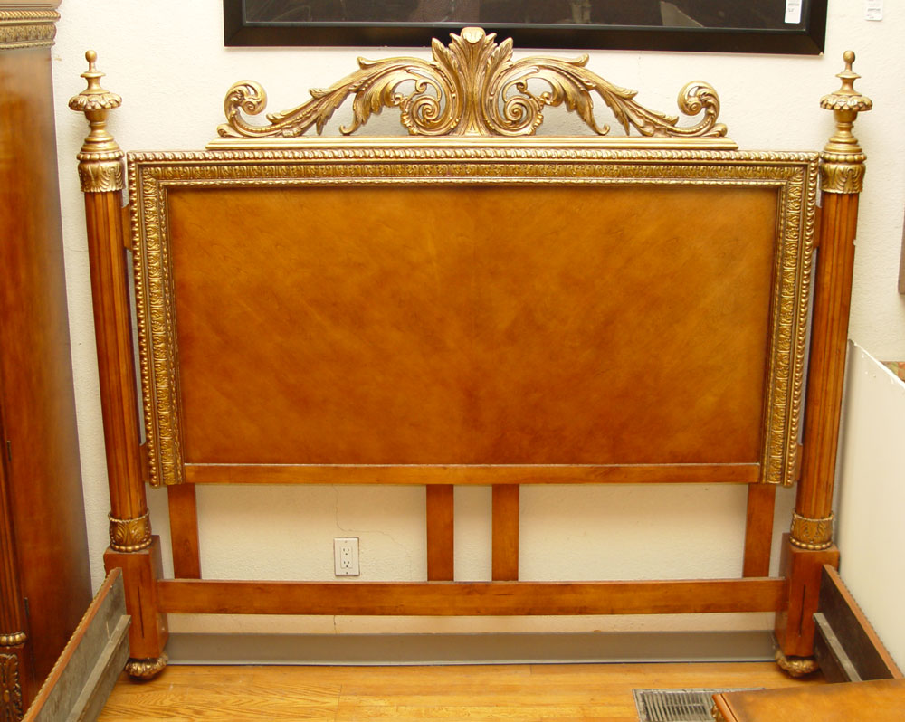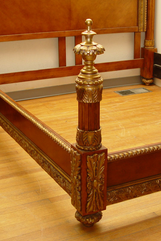 4 PIECE HORCHOW ''BELLISSIMO'' BEDROOM SET: King bed, 94'' L x 84''W. Headboard is 73''T. Footboard is 41''T. Pair of three drawer NIGHTSTANDS, 34''W x 18''D x 32''T. Triple use mirror front ARMOIRE with single full length drawer across the bottom, the interior with clothes rod, two adjustable shelves, two drawers, and punch-out back, 48''W x 25''D x 84''T. Elaborately carved and crafted of hardwood and decorative resin with mahogany colored finish with gilt highlights. Original retail price of $5998.oo