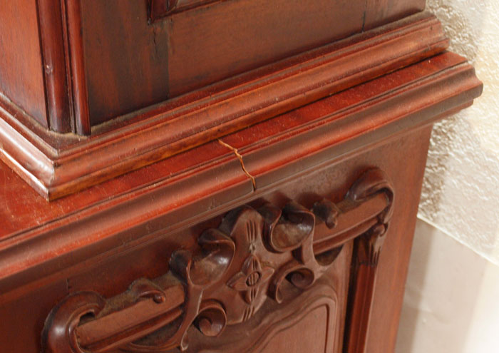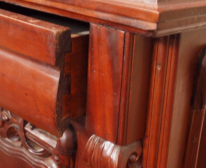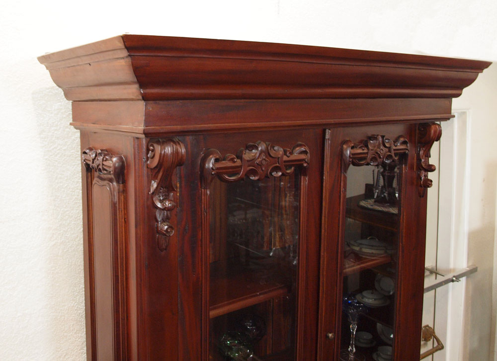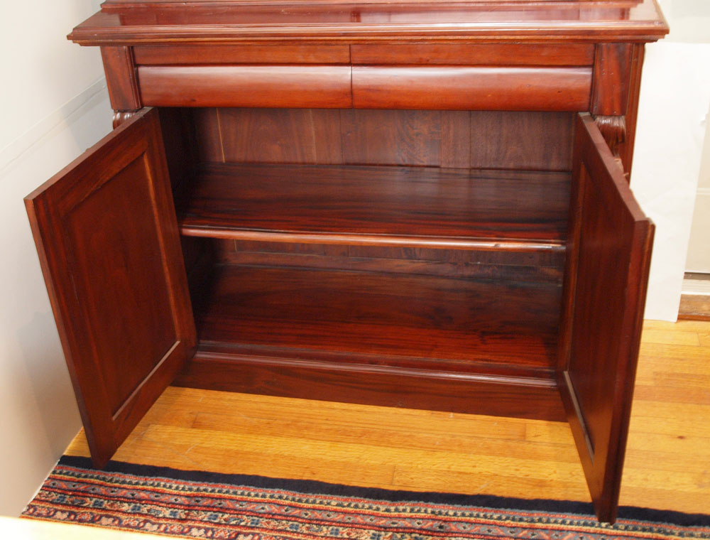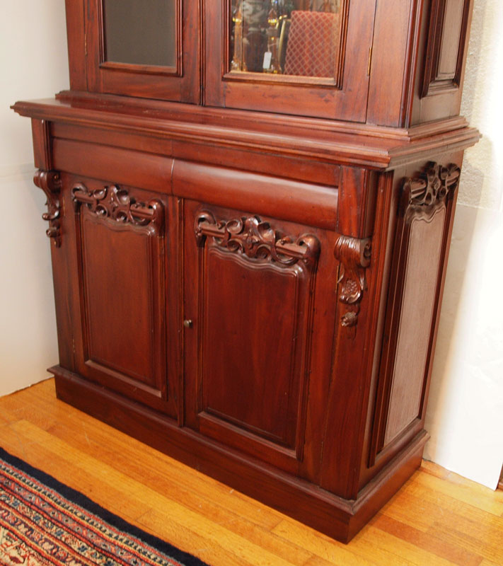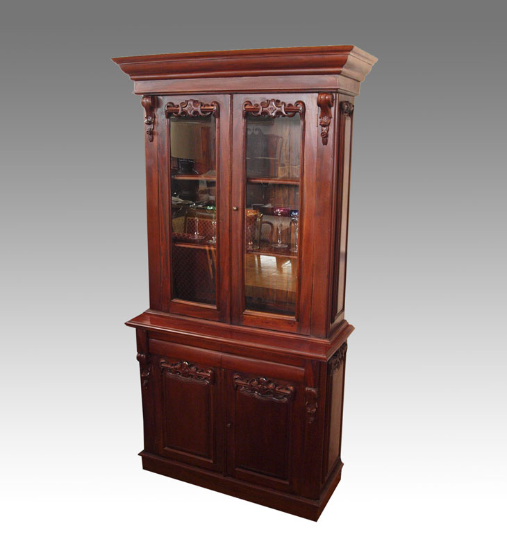 MAHOGANY 2 PART CHINA CABINET BOOKCASE: Top with 2 glass doors and 2 interior shelves over 2 drawer 2 door base. Applied carved decoration. 86 1/2'' h. x 2 1/2'' x 18''.