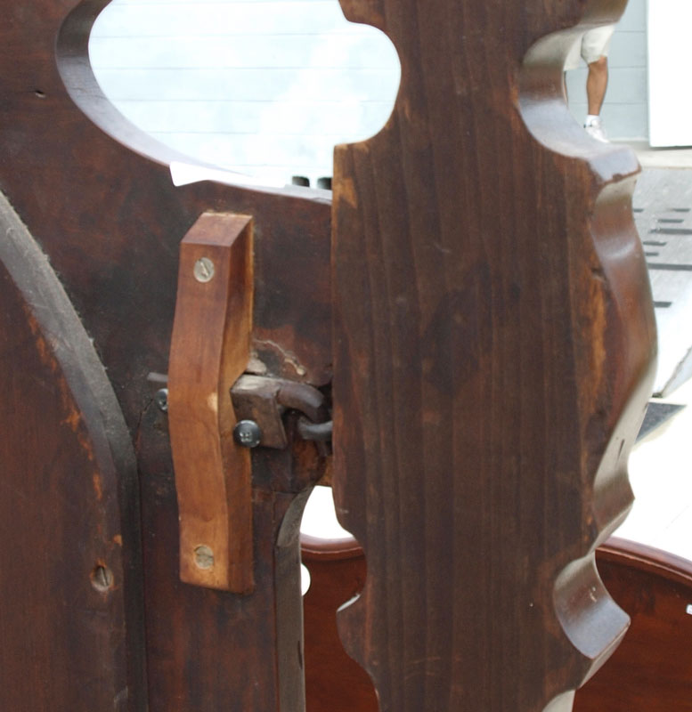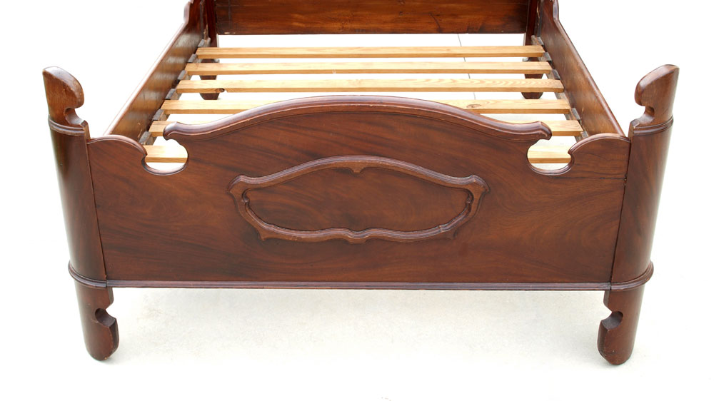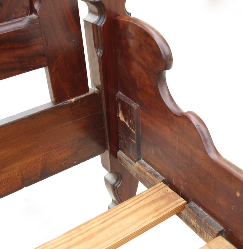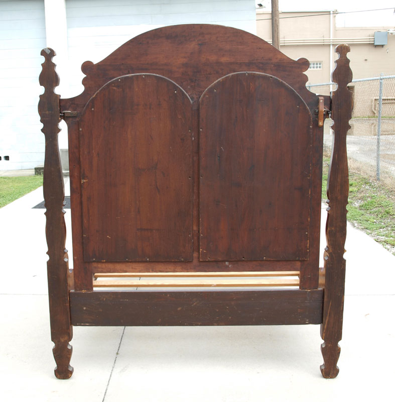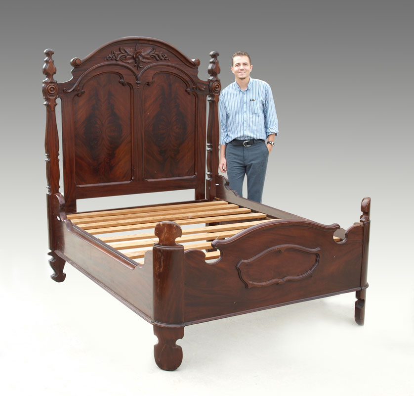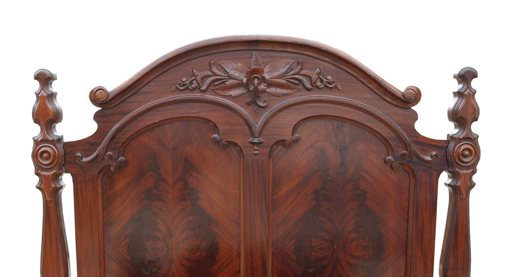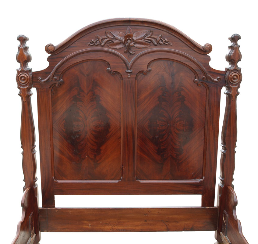 VICTORIAN DOUBLE PANEL BUTTERFLYED FLAME MAHOGANY VENEER BED: Arched crest with applied carving of lilies, arched and curved footboard. Head with posts is 72'' tall, 54 1/2'' wide. Foot is 29'' tall, 60'' wide.