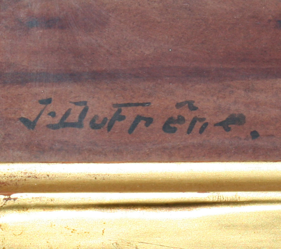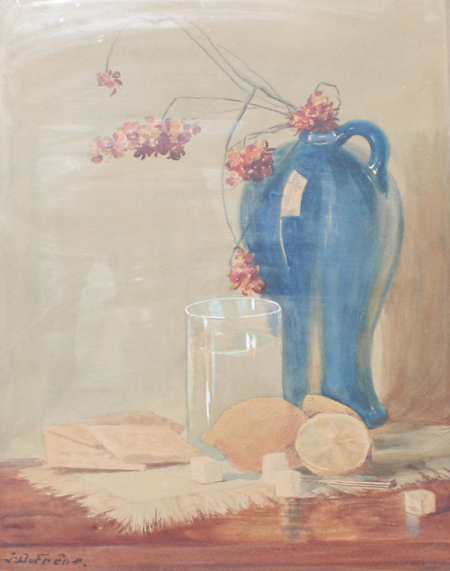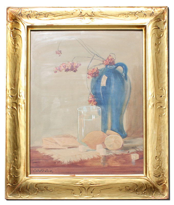 EXCEPTIONAL PERIOD STILL LIFE SIGNED J. DUFRENE IN PERIOD NOUVEAU CARVED AND GILDED FRAME: Frame measures 23'' x 19'', painting measures 17 3/4'' x 13 1/2'', depicts a blue porcelain vase with glass of water and lemonade pitcher.