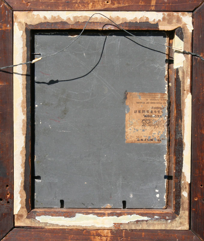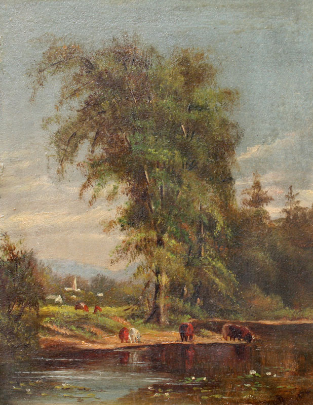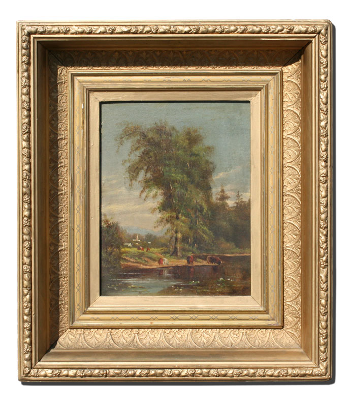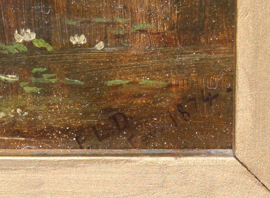 19TH CENTURY COUNTRY LANDSCAPE WITH COWS WATERING: Monogrammed E.L.D, dated 1874, OIL/Board, 9'' x 7'', period gilded frame with overpaint and wear, 15 1/2'' x 13 1/2''.