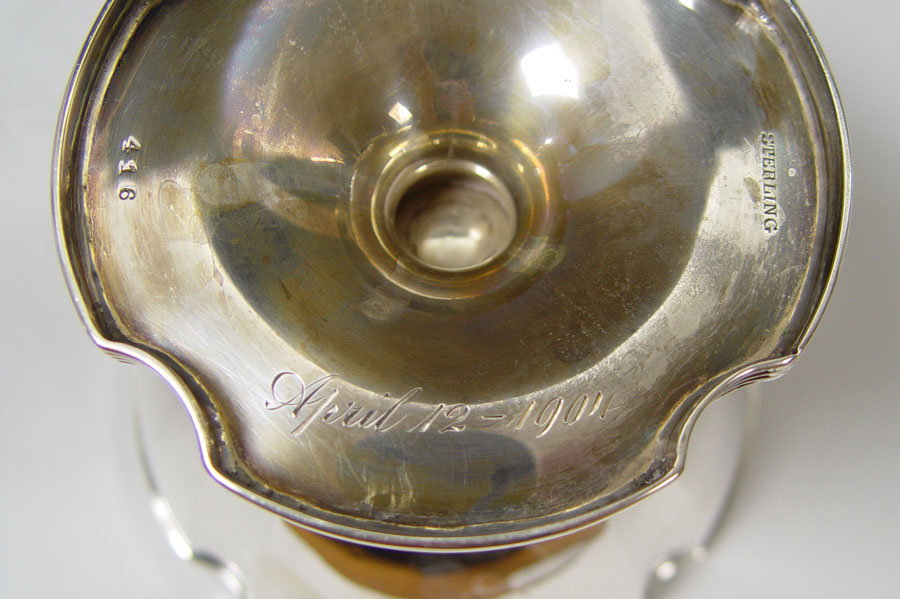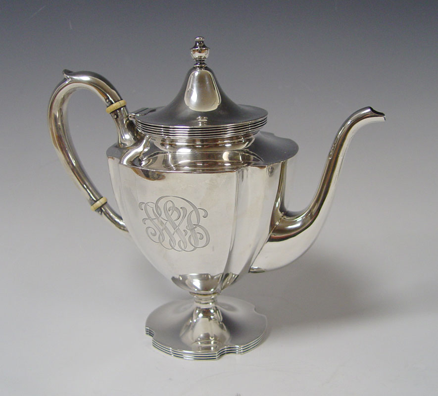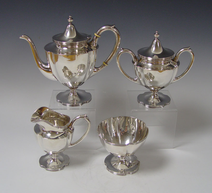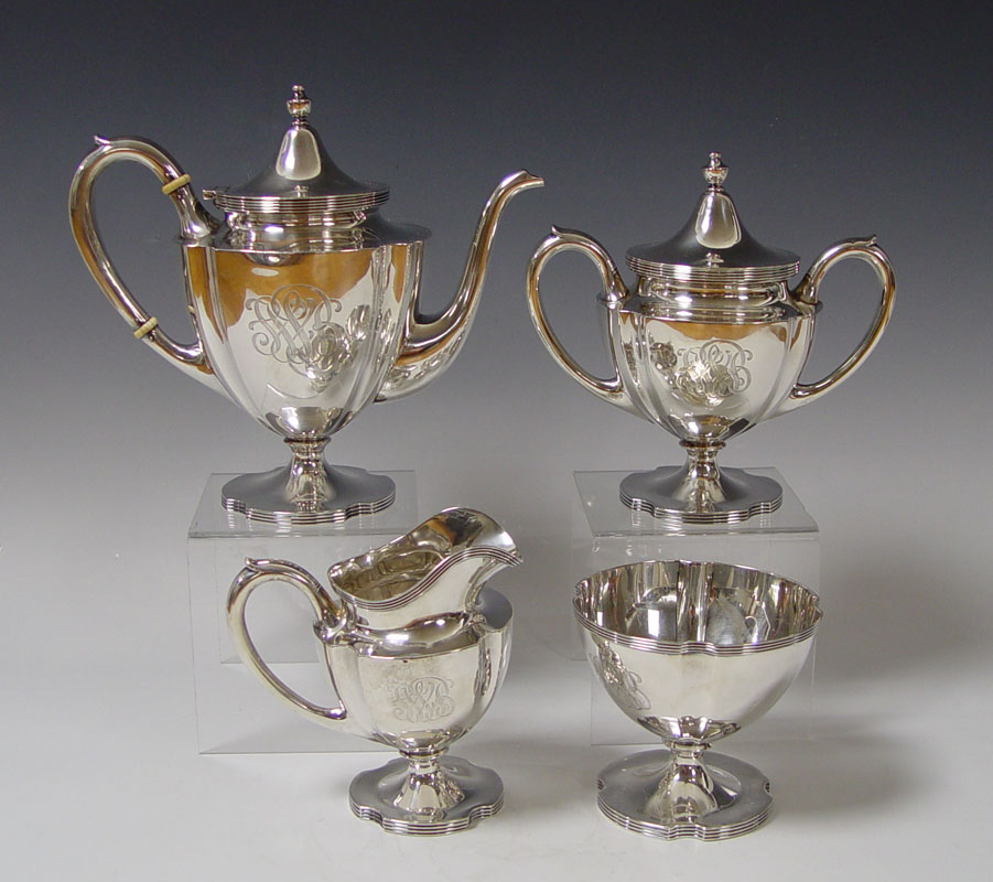 4 PIECE STERLING TEA SERVICE: Simply marked Sterling and 416, no makers or dealers name. All pieces monogrammed and dated April 12, 1904. To include 1) Teapot with hinged lid and bone heat shields, 9 1/2'' x 10 1/2''. 2) Covered 2 handled sugar, 8'' x 8 1/4''. 3) Open creamer 6'' h. x 6''. 4) Open waste bowl, 4 1/2'' x 5 1/4'' dia. Approx. 50.6 troy oz.