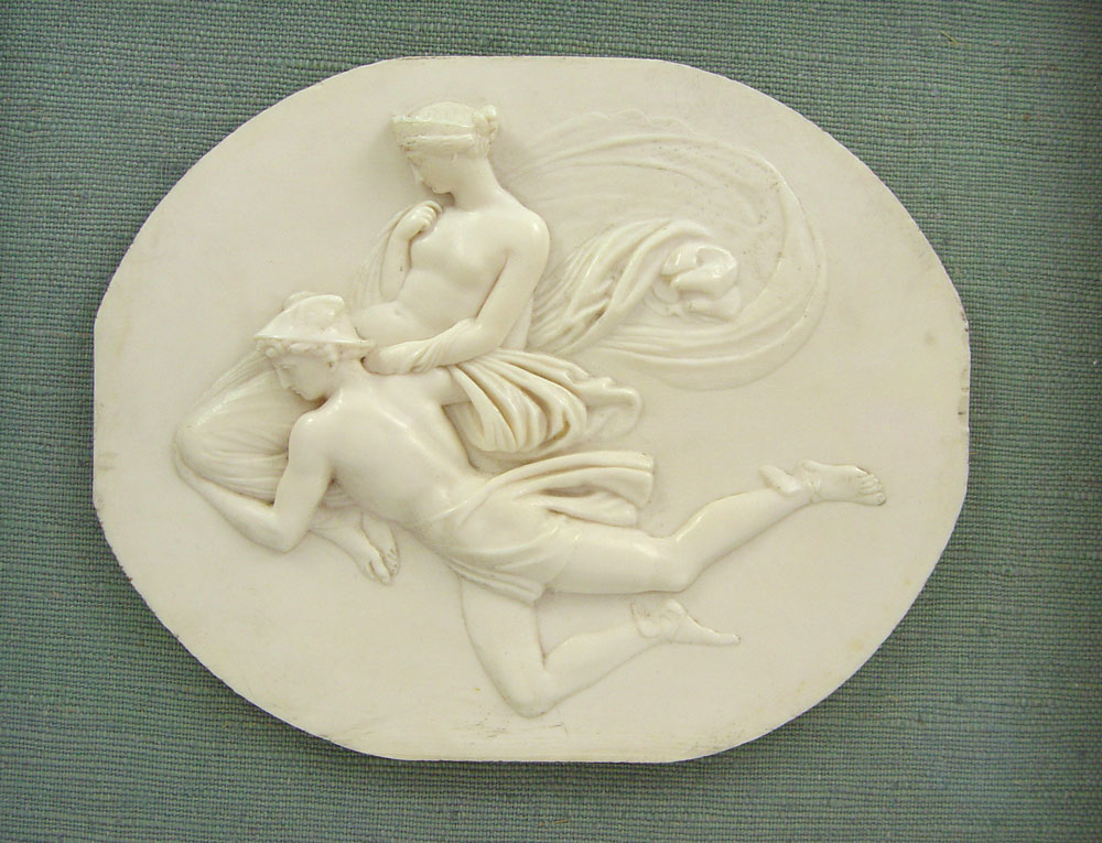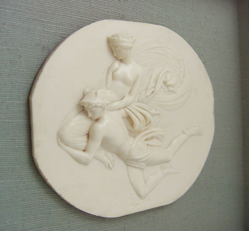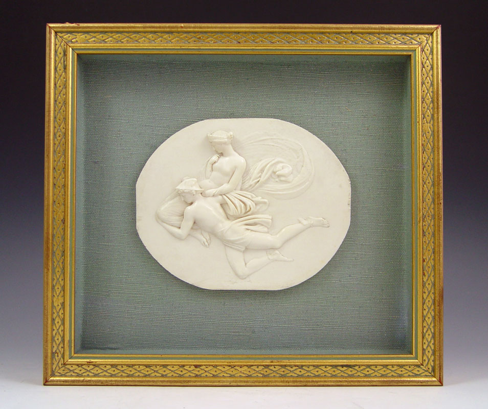 CARVED ANTIQUE IVORY MERCURY PLAQUE: Depicts Mercury with young nude beauty, 5'' x 6 1/4'', framed, 10 1/4'' X 11 1/4''. From the collection of Banana George Blair. From the collection of Banana George Blair.