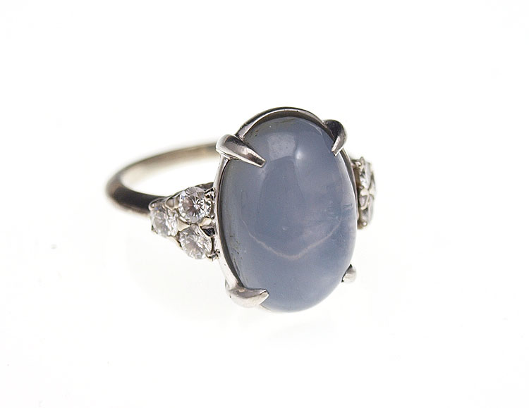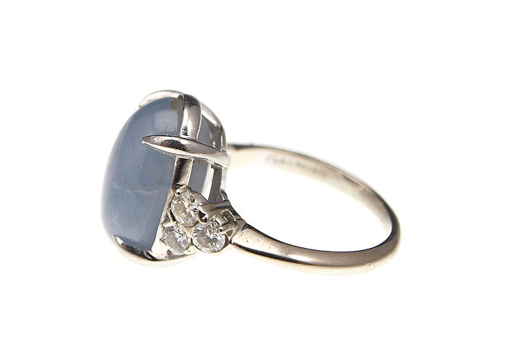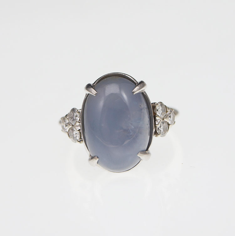 10CT STAR SAPPHIRE PLATINUM RING WITH DIAMONDS: Platinum on 18K white gold ring contains one oval shaped blue star sapphire. WEIGHT: 10.60 Ct. Approx. Six ray, of f center star. vB in hue, 2-3 in Tone and 2-3 in Saturation. Six round brilliant cut diamonds. WEIGHT: .35 Ct. Approx. The diamonds average VS in clarity and G in color. The sapphire and diamonds are prong set. Weight: 5.9 grams Size: 4.5