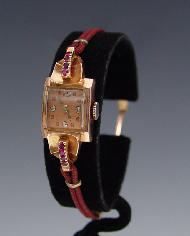LADIES 14K ROSE GOLD ART DECO WATCH WITH RUBIES: Solid 14K Art Deco watch with 17 jewel Swiss movement, in running order. 8 rubies on top bezel. Cord strap, ratchet style clasp.