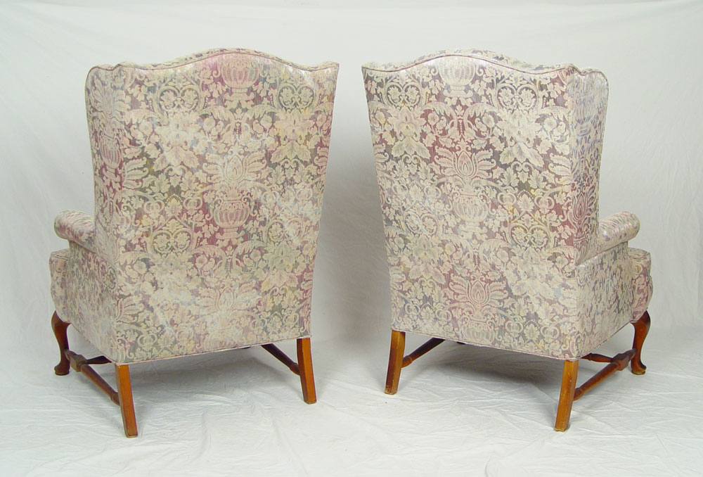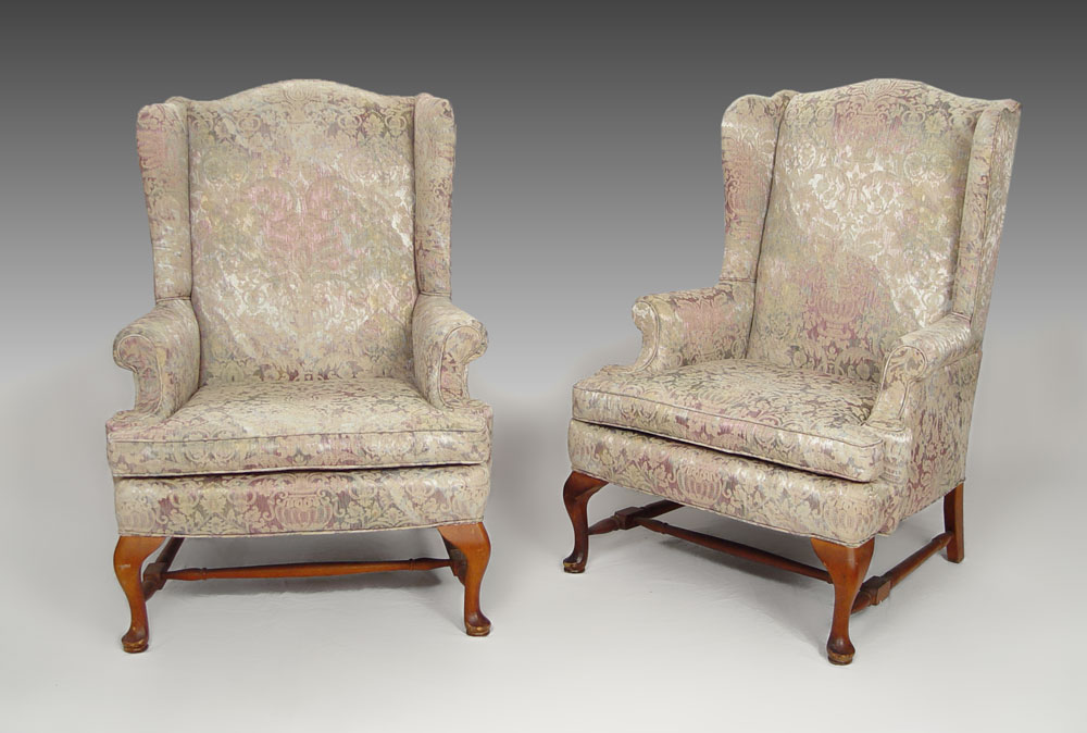 PAIR ROLL ARM HIGH WING BACK CHAIRS: With Queen Ann legs. Finished in Fortuny style silk brocade fabric. 43'' h. x 31'' x 31''.