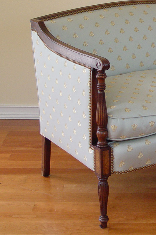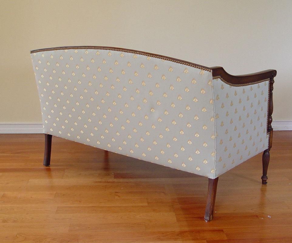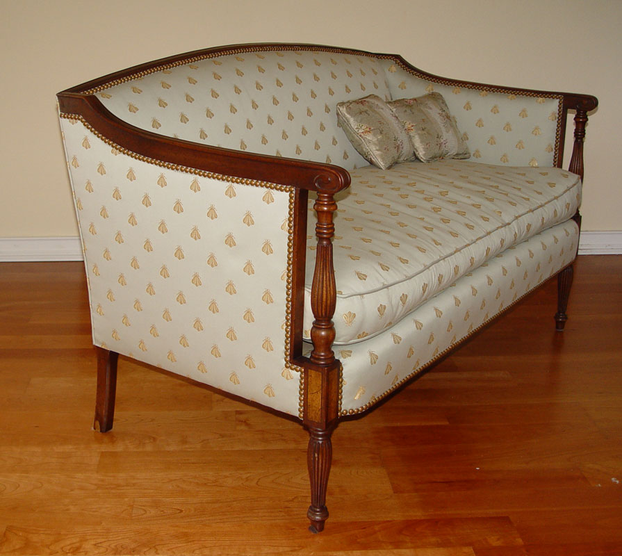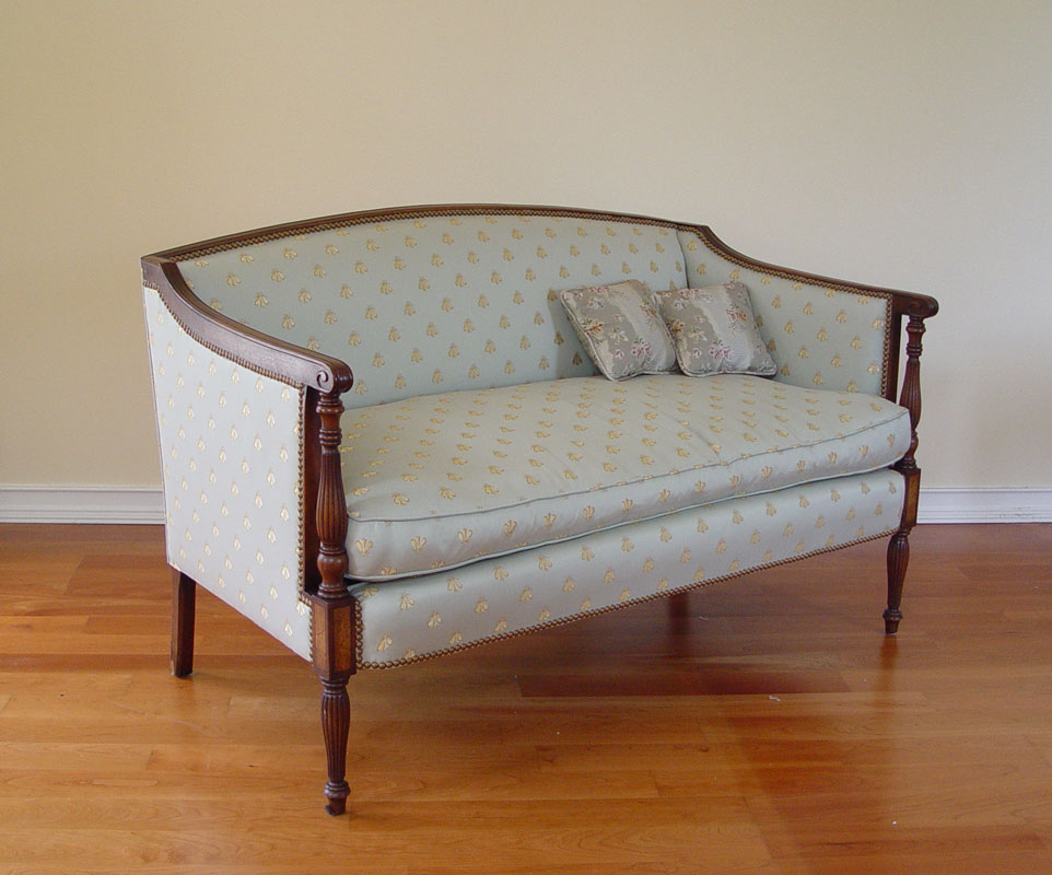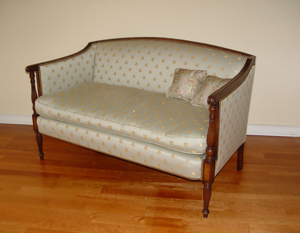 HICKORY CHAIR CO. SHERATON STYLE LOVESEAT: Carved rolled arms with continuous turned and fluted legs. Brass studded green bumble bee fabric a soft green. 33'' x 53'' x 32''.