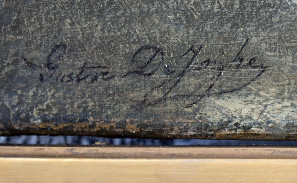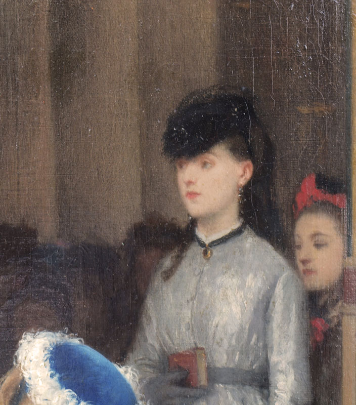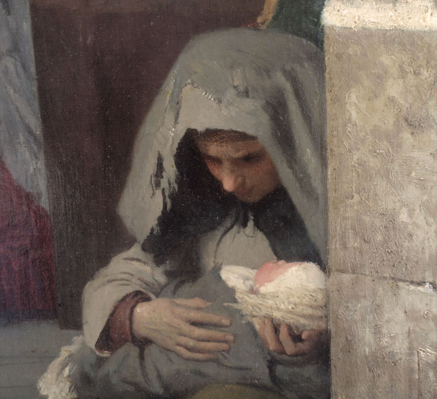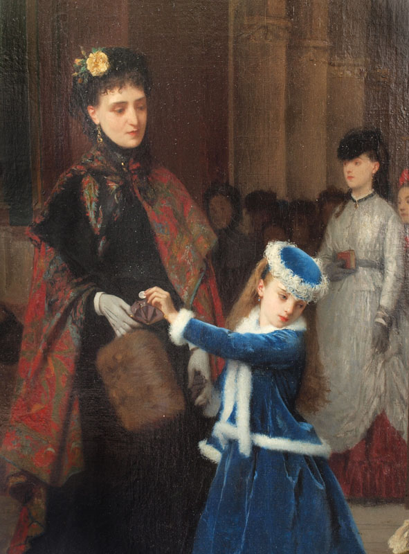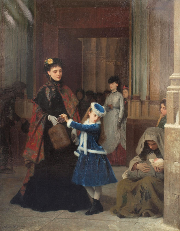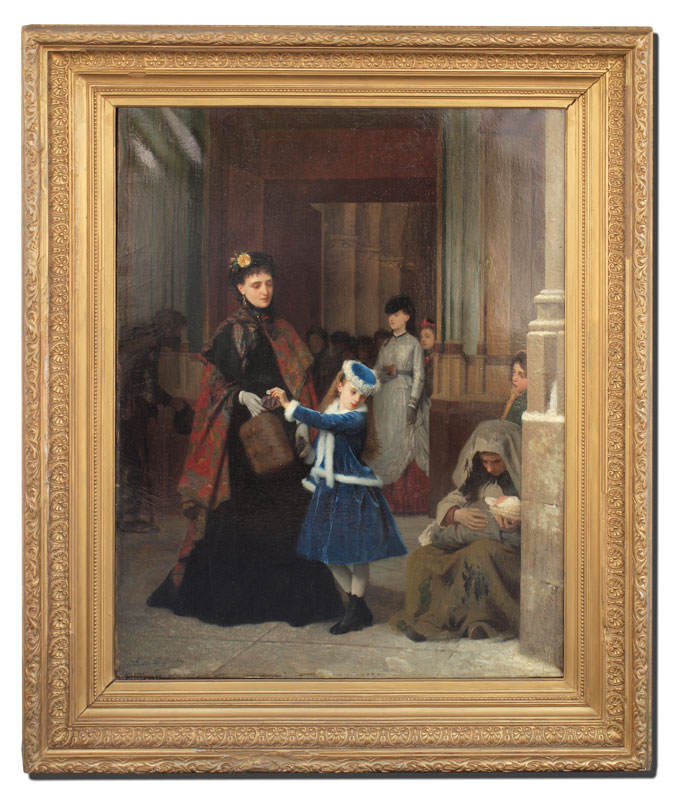 DeJONGHE, Gustave Leonhard, (Belgium, 1829-1893), : ''Kind Heart'', Oil on Canvas, depicts the kindness of a child with her mother giving money to a young, less fortunate mother cradling her infant, signed LL, Gustave DeJonghe, 34'' x 25 1/4'', gilded frame with overpaint and in need of maintenance, 44'' x 33''.