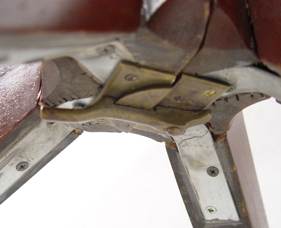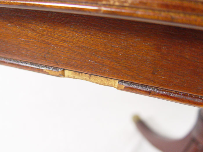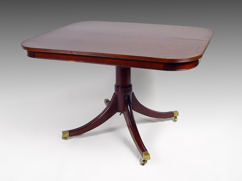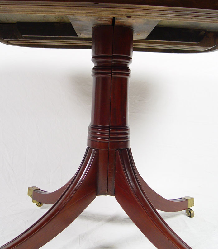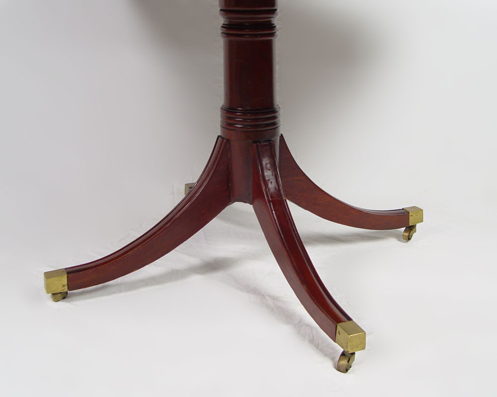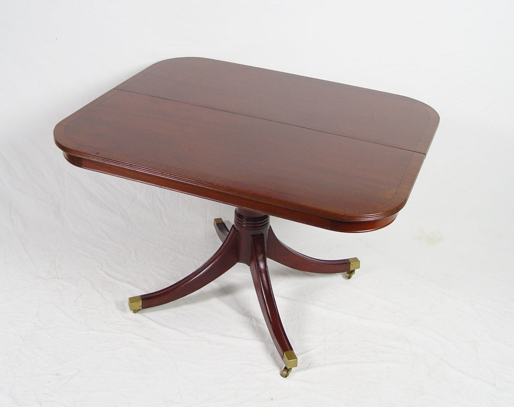 MAHOGANY SPLIT PEDESTAL GAME TABLE: String inlay top. Center pedestal with 4 splay legs, brass capped with castors. 25'' h. x 36'' square.