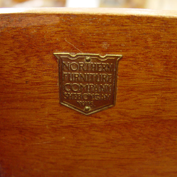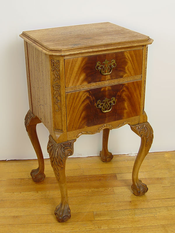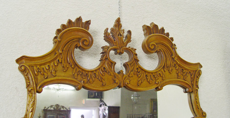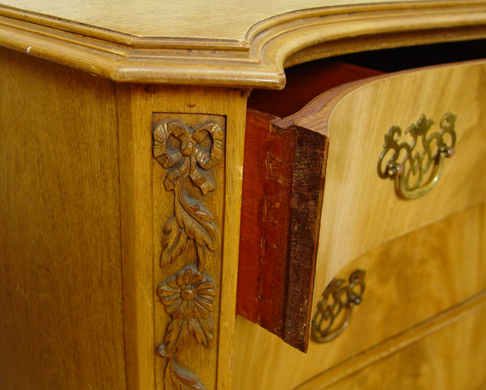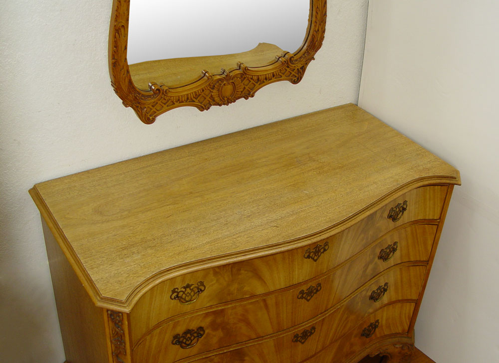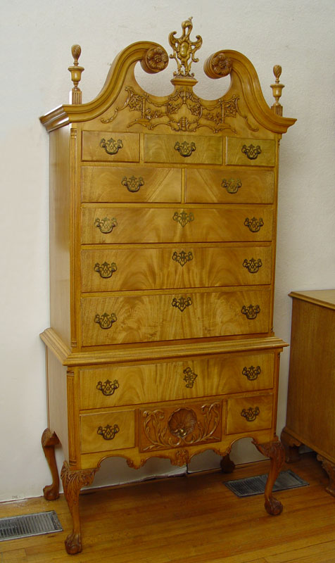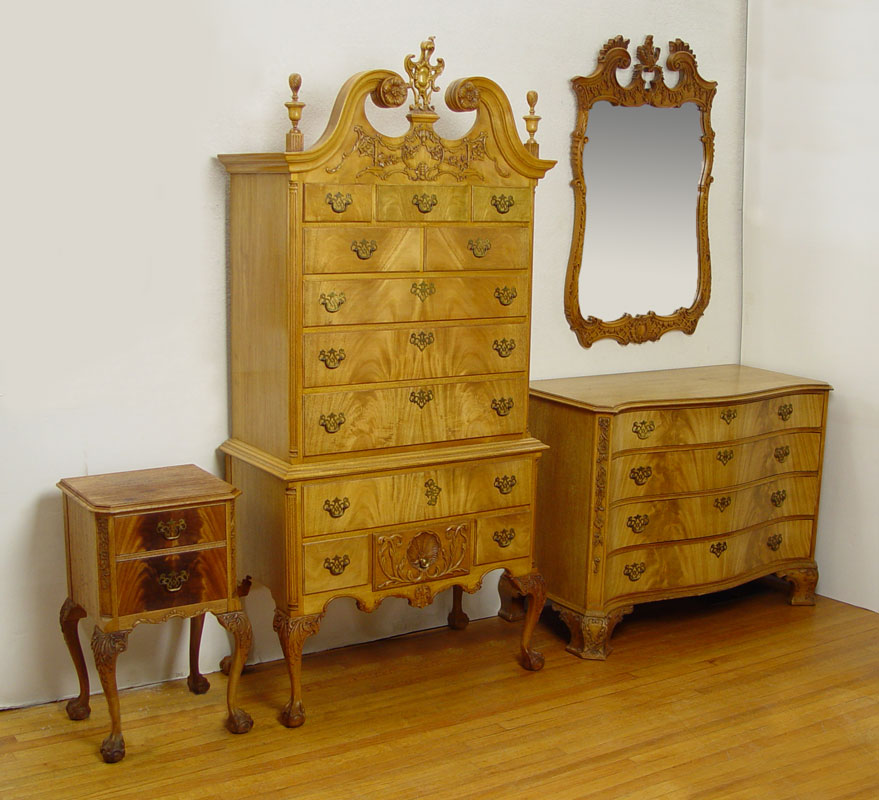 NORTHERN FURNITURE CO HIGH BOY, CHEST, MIRROR & NIGHTSTAND: 4 piece carved light mahogany bedroom furniture. The HIGHBOY has 12 drawers, ornate pediment, and carved cabriole legs, and measures approx. 81'' tall x38'' x 20''. The 4 drawer serpentine front CHEST, 36'' 48'' x 23''. MIRROR , 46'' x 29'' overall. The 2 drawer nightstand measures 30'' x 18'' x 15''.