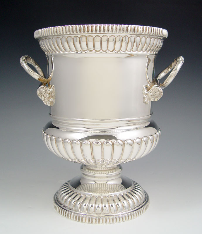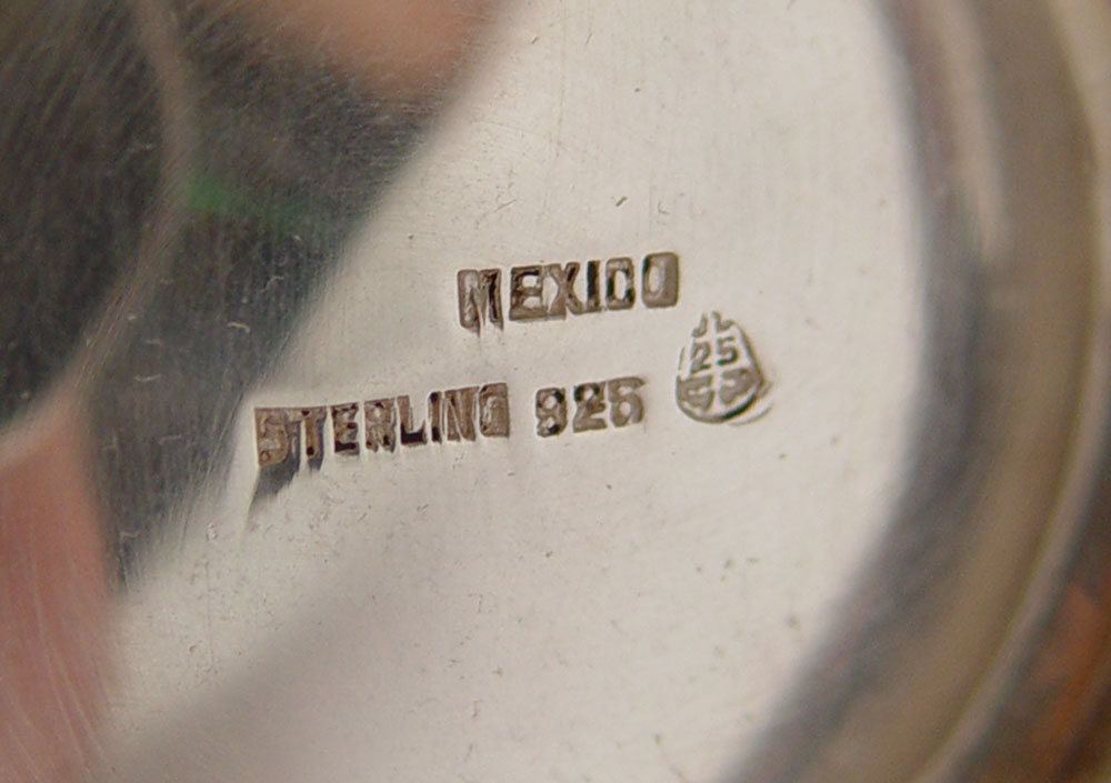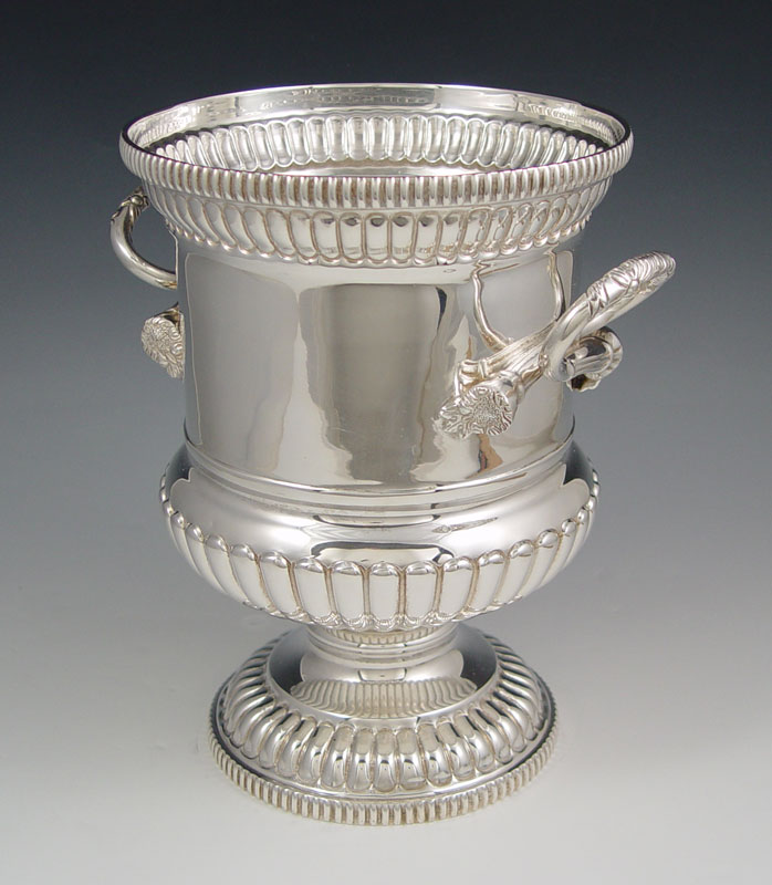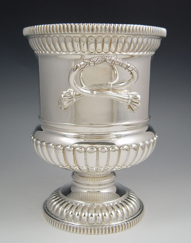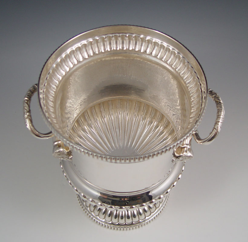 LARGE MEXICAN SILVER CHAMPAGNE BUCKET: Marked Mexico Sterling 925 with eagle 25 hallmark. No makers hallmark but this number was used by Tango Aceves and others. 10 1/4'' h. x 9 1/4'' overall. Approx. 56.7 troy oz.