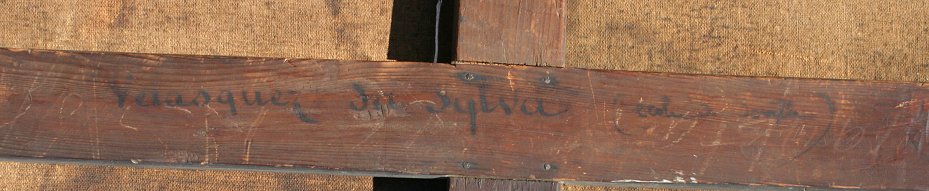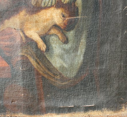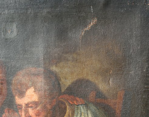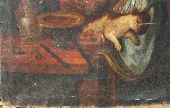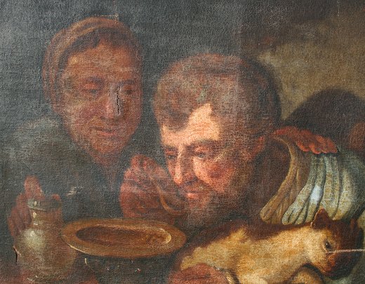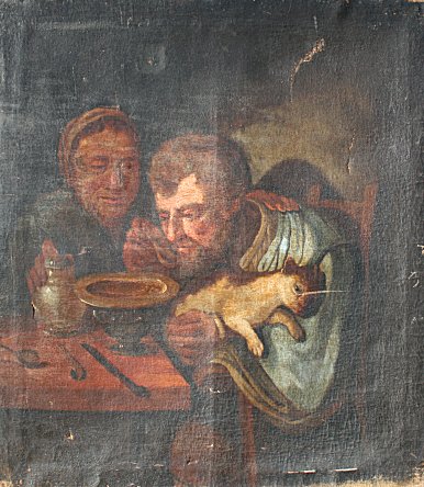 OIL/CANVAS EARLY PAINTING AFTER VELASQUEZ? 17TH? CENTURY: 45'' x 39 3/4'', unframed, depicts and elderly man and woman eating dinner at the table with pet cat, 18th/perhaps 17th C. canvas, old stretcher is in need of repair.