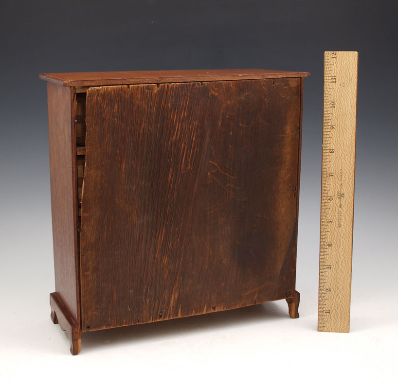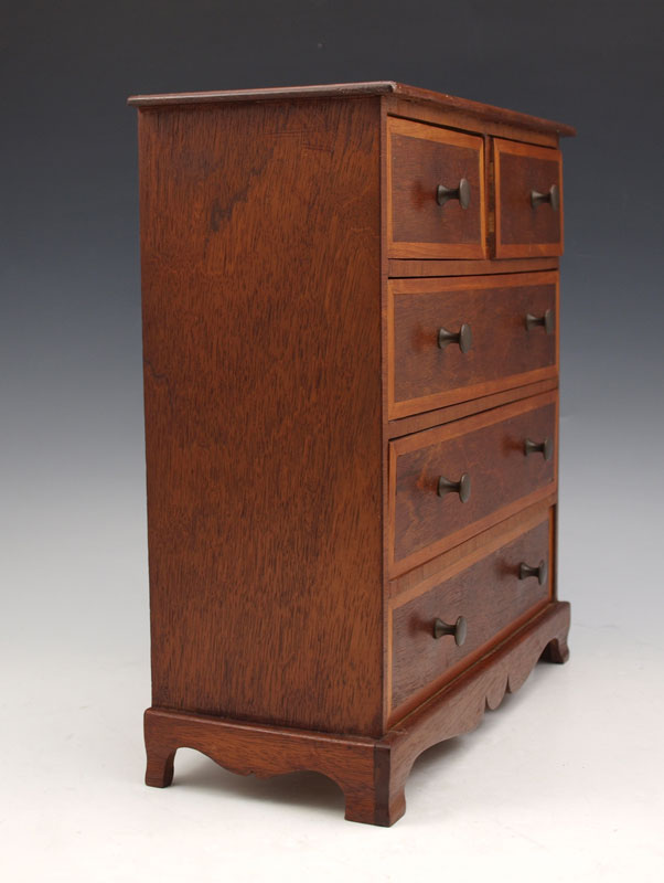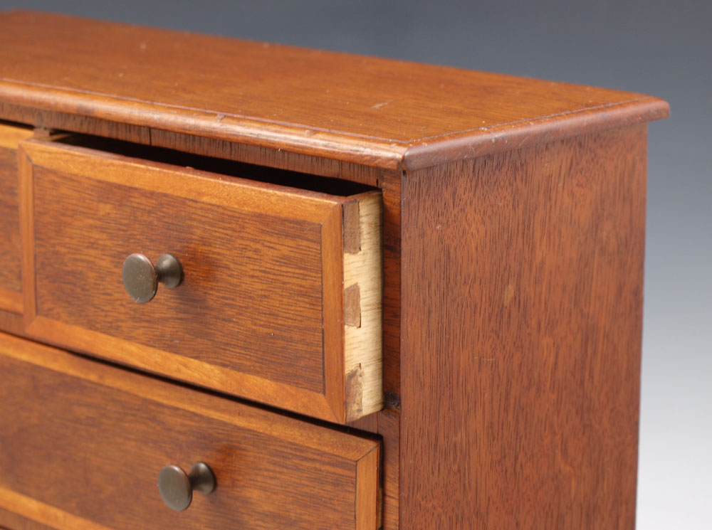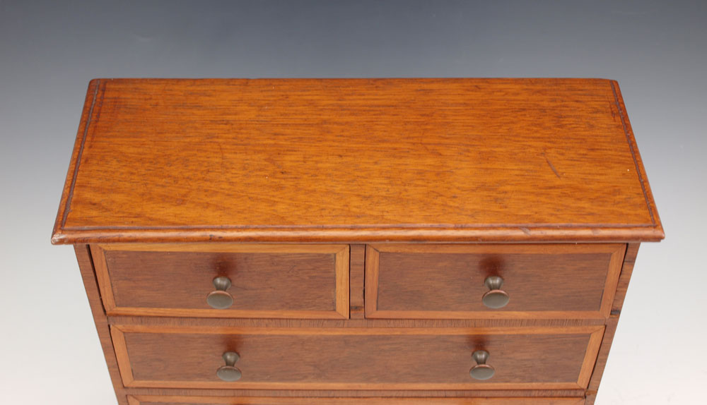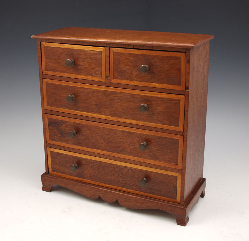 MINIATURE BANDED MAHOGANY CHEST: 2 half drawers over 3 full drawers. 11 1/4'' h. x 10 3/4'' x 4 1/2''.
