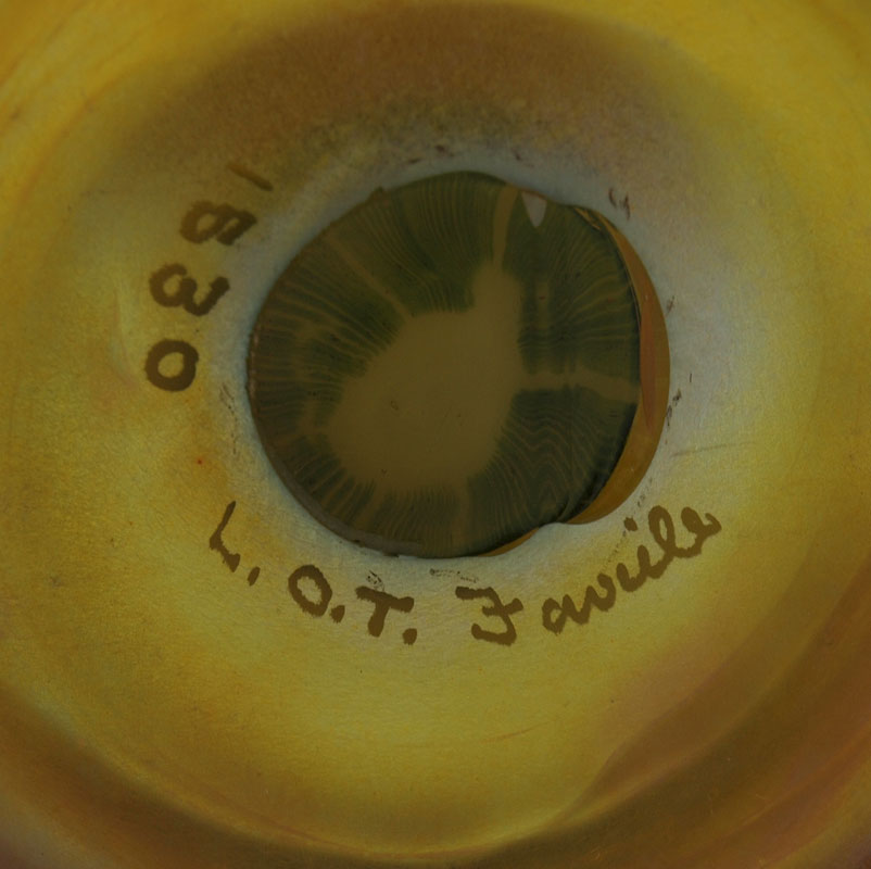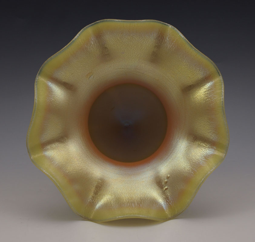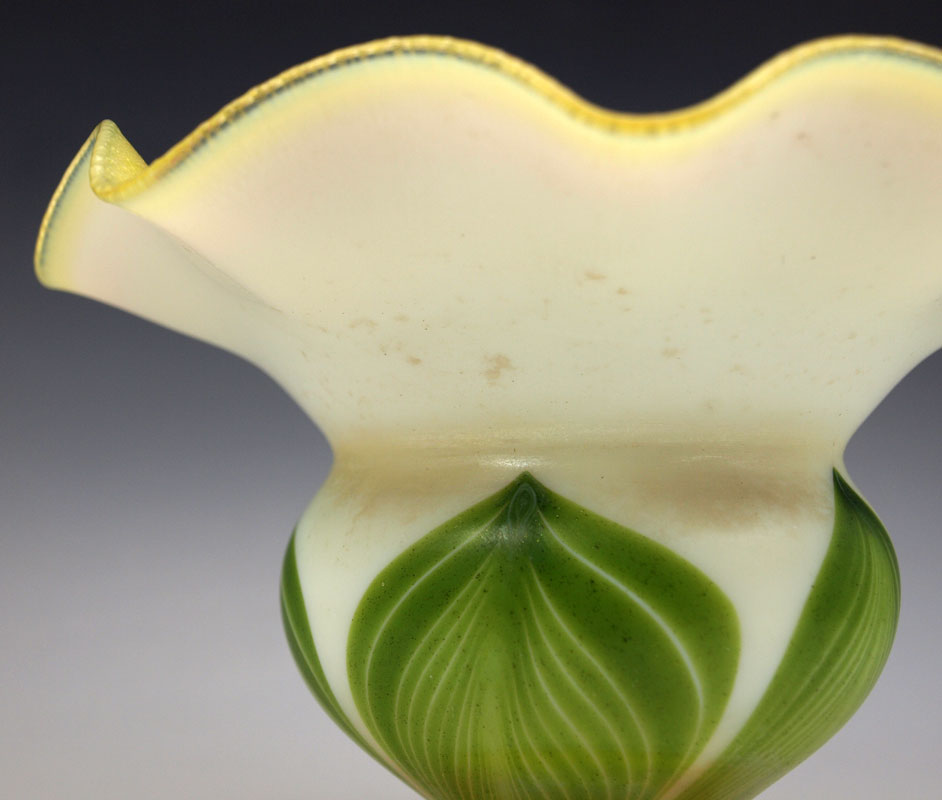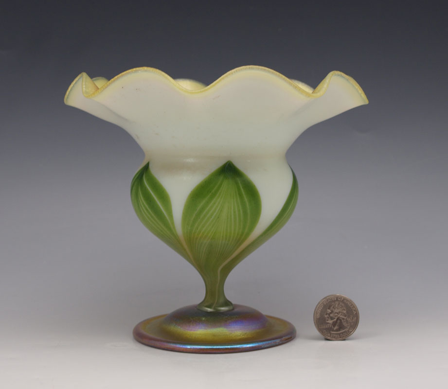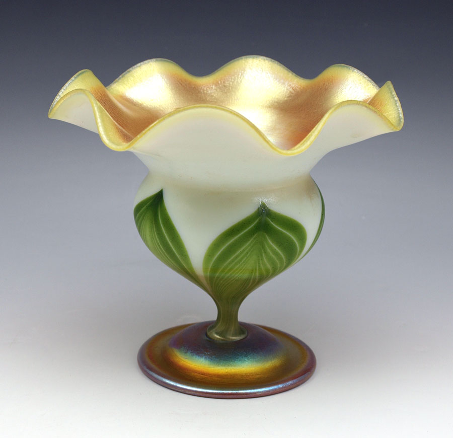 TIFFANY FAVRILE ART GLASS PEDESTAL VASE: Floriform with a pulled feather design. Signed L.C.T. Favrile, numbered 1830. 5 1/2'' tall x 6 1/2'' dia.