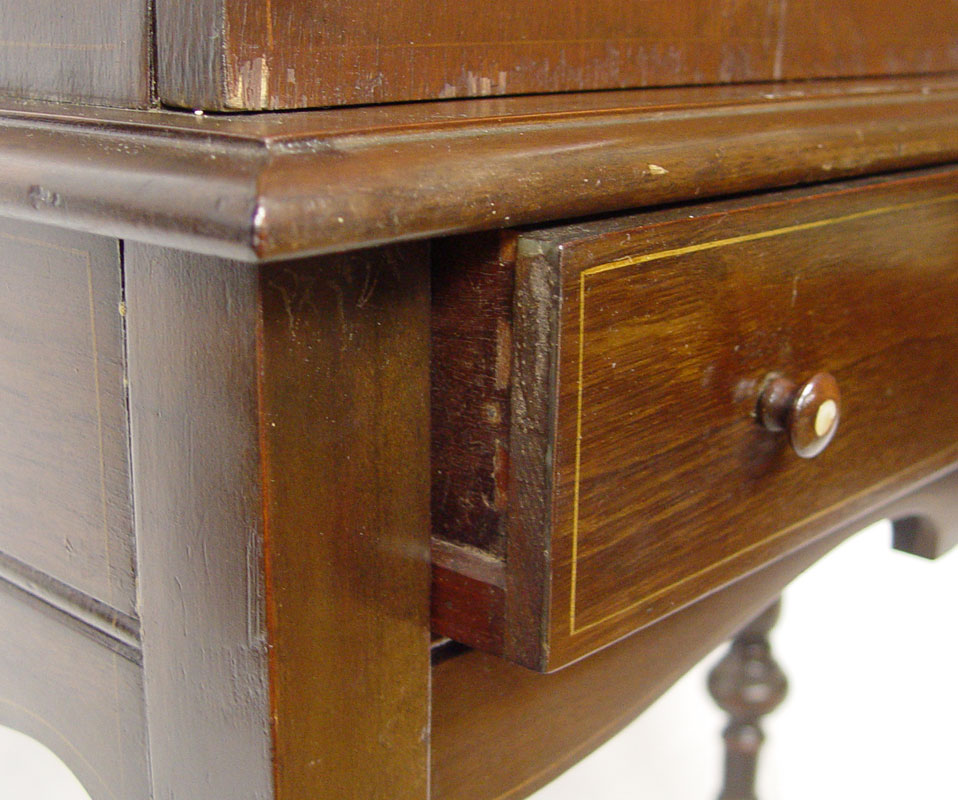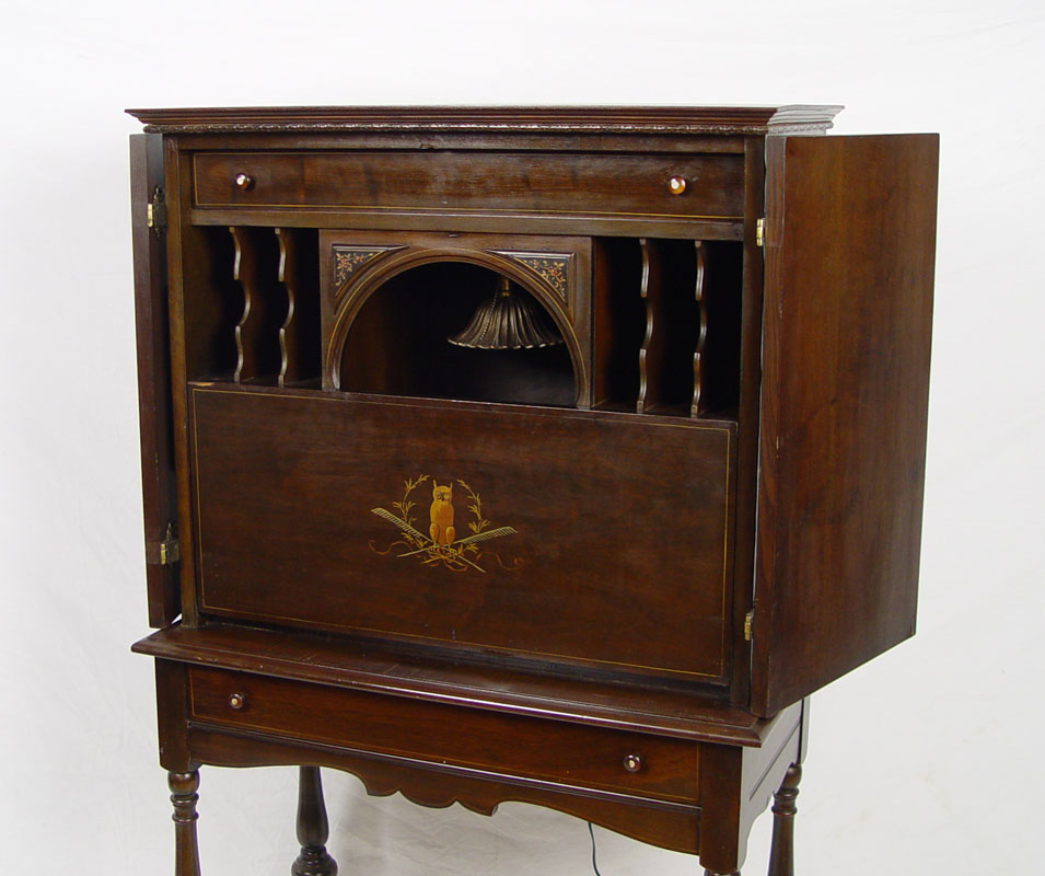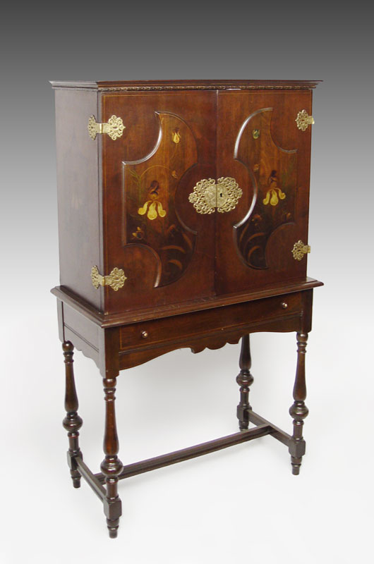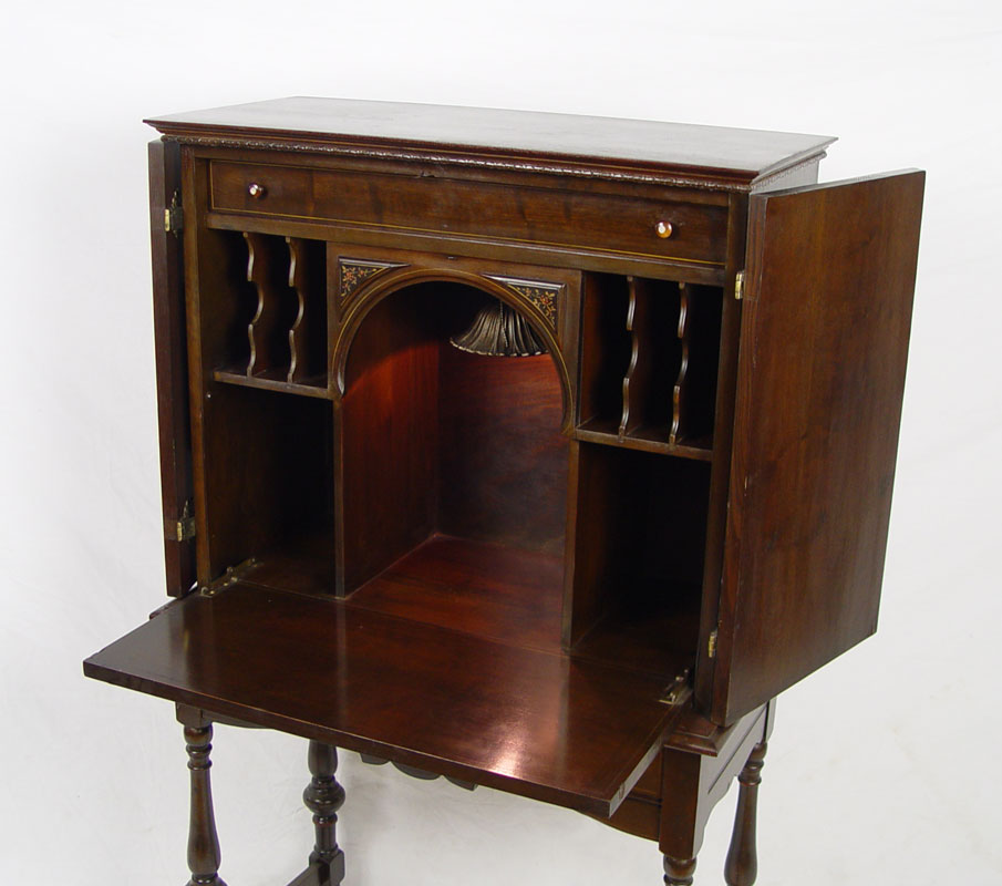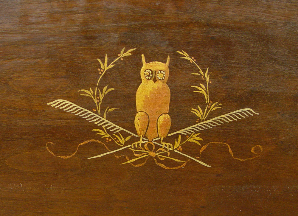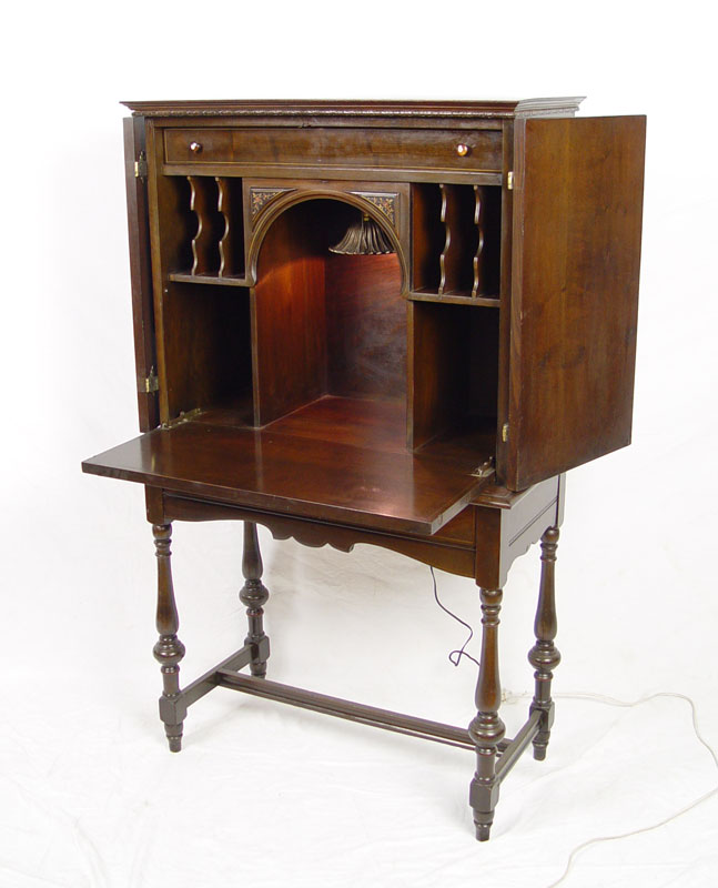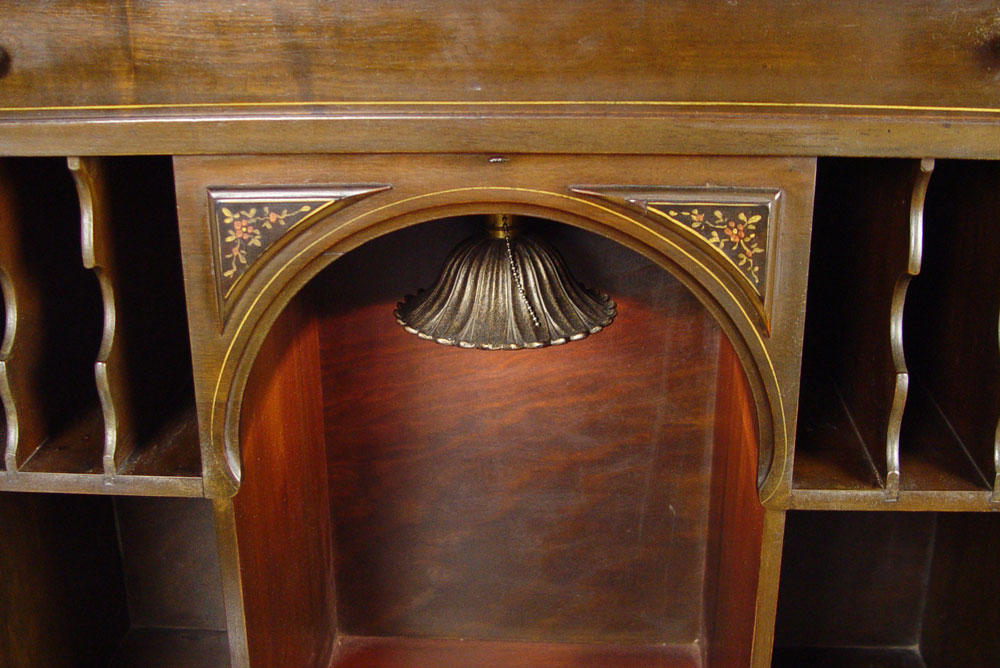 1920'S PAINT DECORATED MAHOGANY SECRETARY: Double door blind front desk. Interior with owl painted on the fall front. Gothic arch shades the light. Pierced brass mounts. 54 1/2'' tall x 31'' x 15 1/2''.