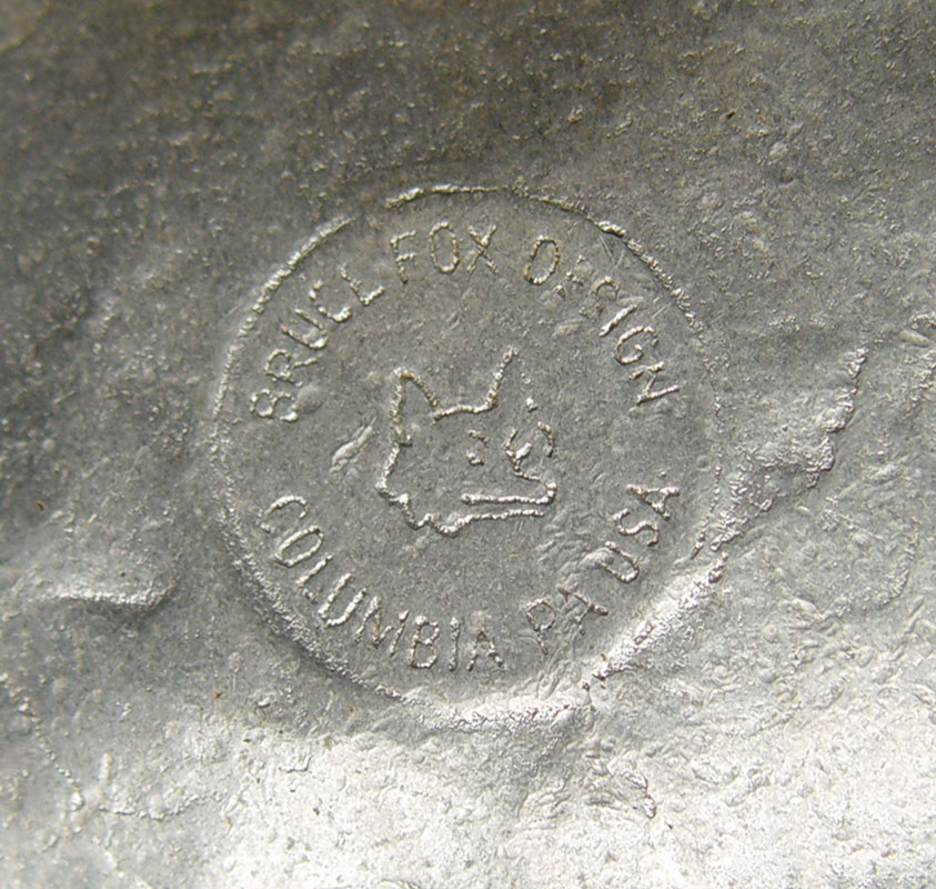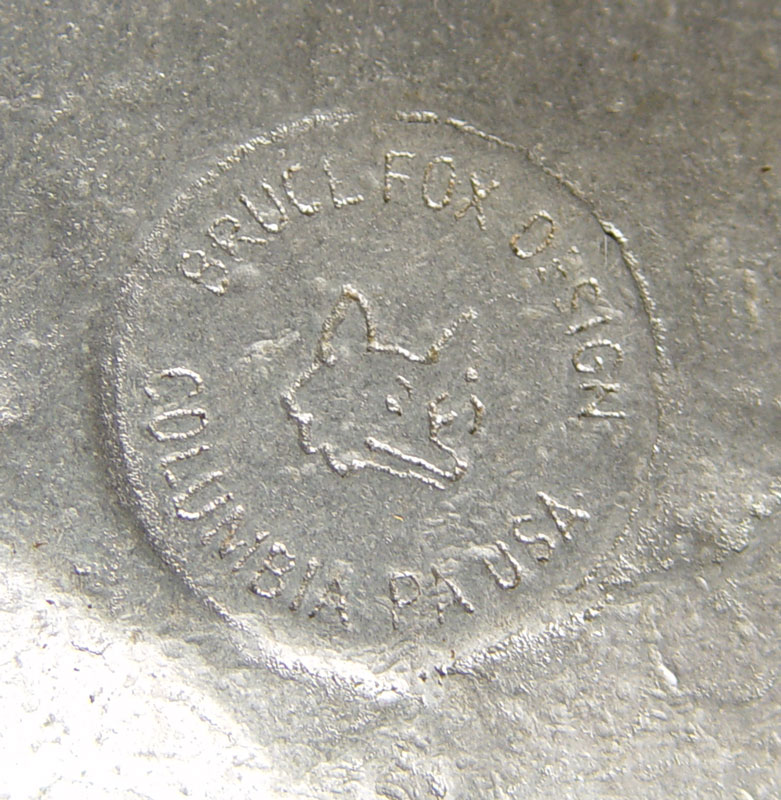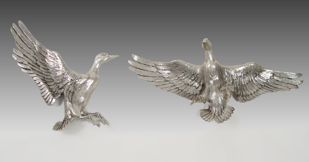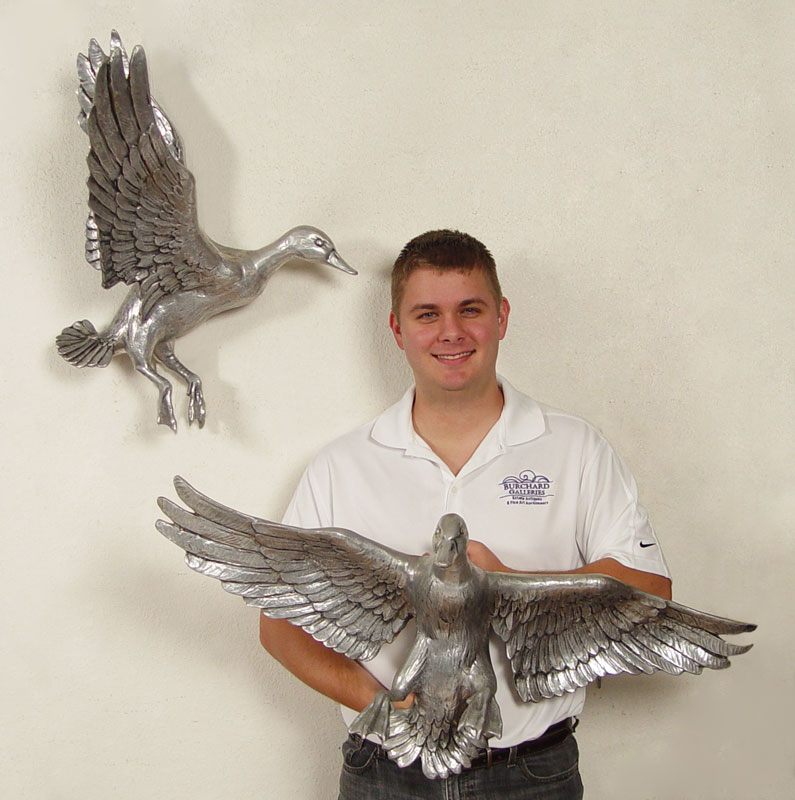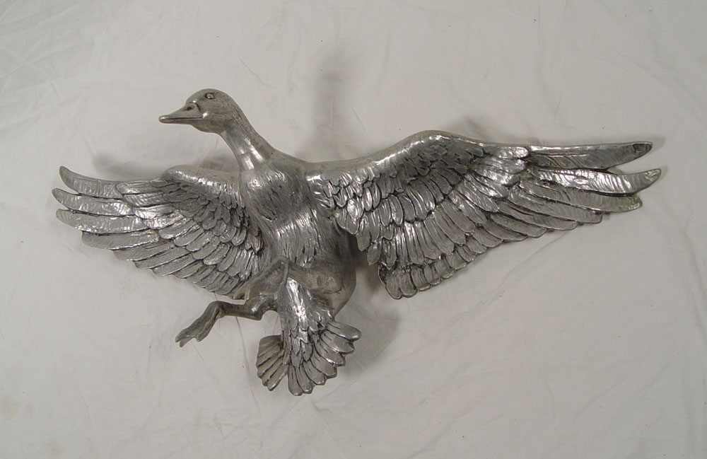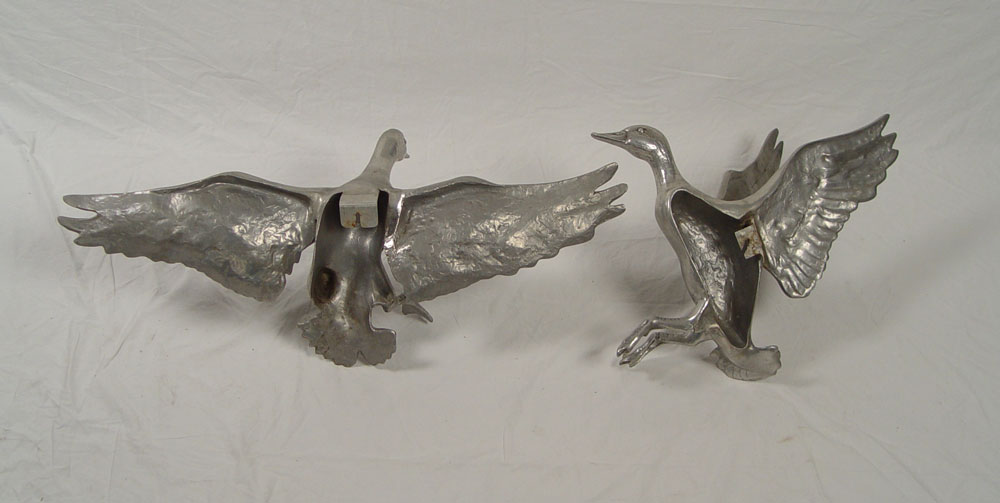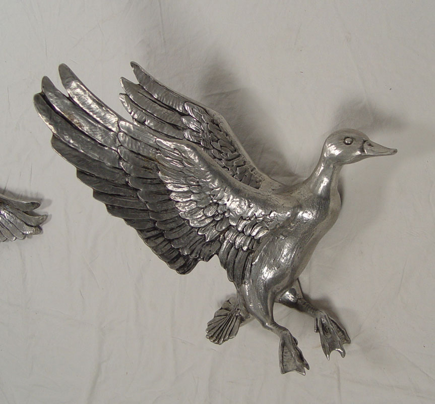 PAIR BRUCE FOX LARGE ALUMINUM MALLARD DUCKS: Wall mount, larger than life, both in flying positions. Impressed Bruce Fox Design, Columbia PA USA mark. Made of aluminum, so perfect for outdoor mounting as well. First measures 17'' x 39'' x 12''. Second measures 27'' h. x 21'' x 16 1/2''.