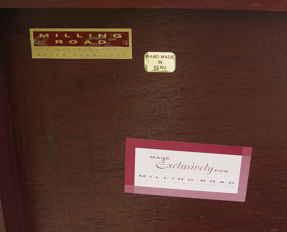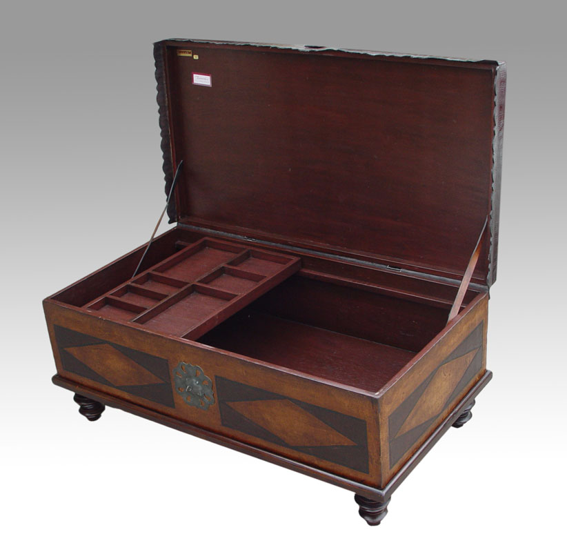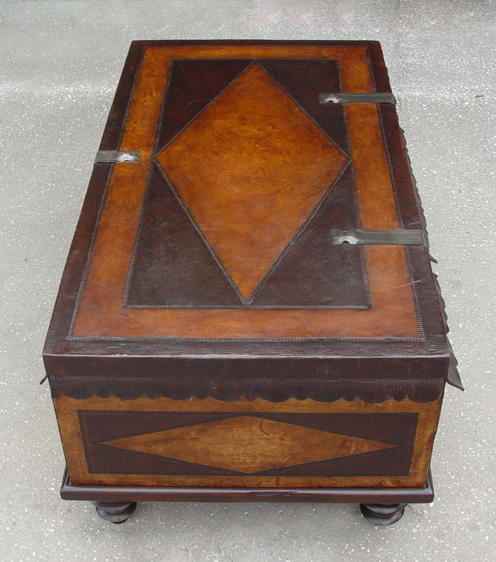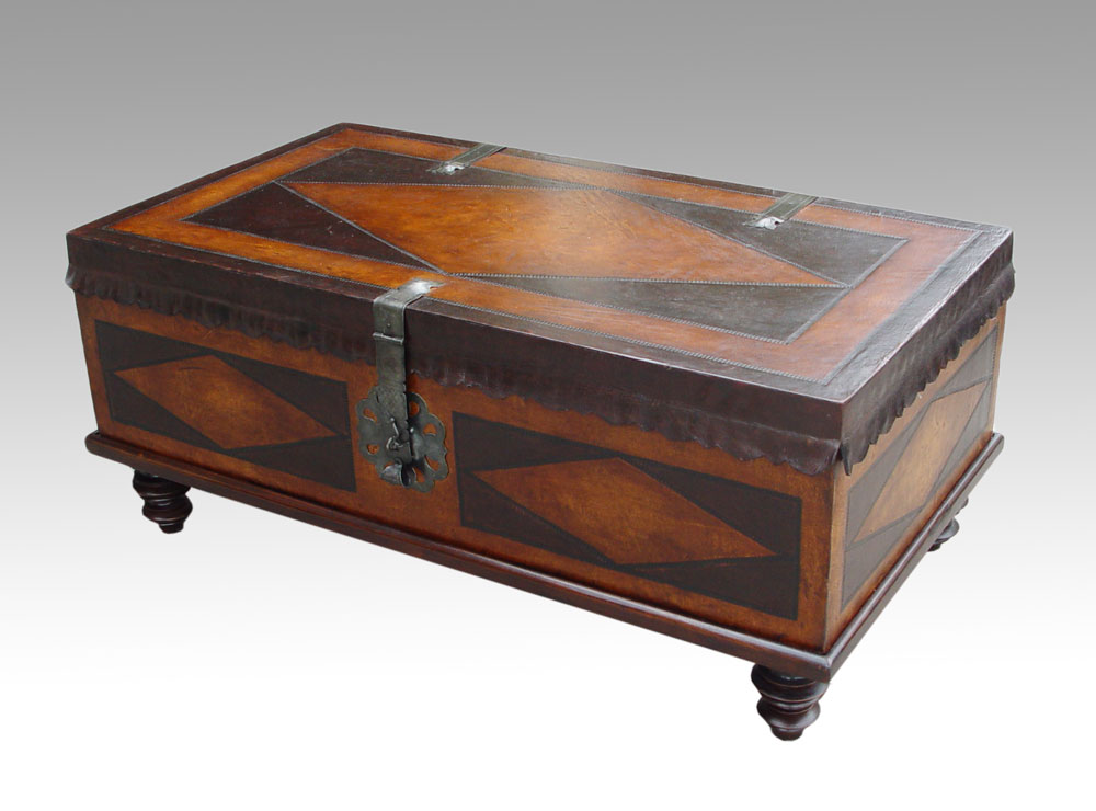 BAKER MILLING ROAD LEATHER CLAD COCKTAIL TABLE: In the form of a trunk with metal hardware, opens for storage. Made in Peru. 20 1/2'' h. x 47 1/2'' x 25 3/4'' .