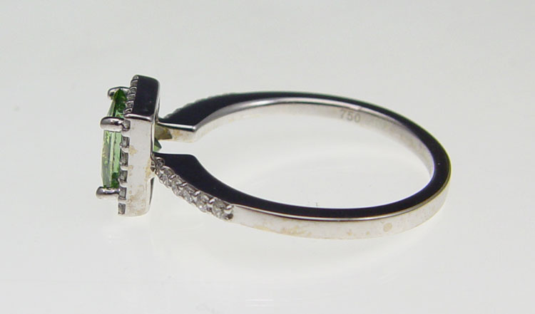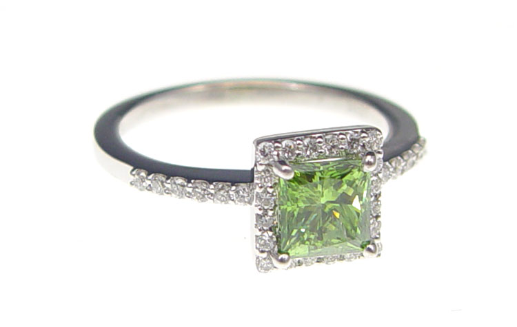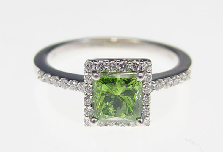 18K GREEN DIAMOND RING: 18K white gold ring centers a single square modified brilliant green diamond, approx. 1.07 Ct., rated I1 in clarity. The green diamond is embellished with 32 round brilliant cut diamonds, approx. total .30 Ct., rated VS in clarity and G-H color. Diamonds are prong set. Weight 3.4 grams. Sold with current Atlanta Gemological Laboratories GIA graduates appraisal for $3,875.