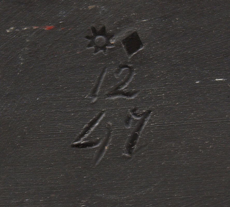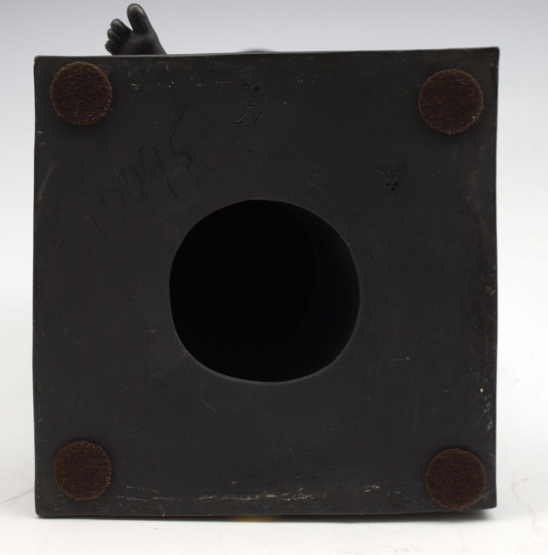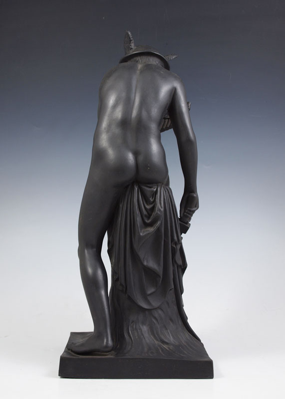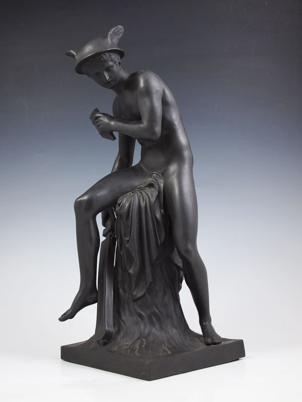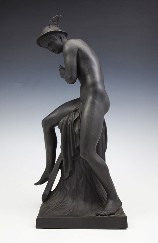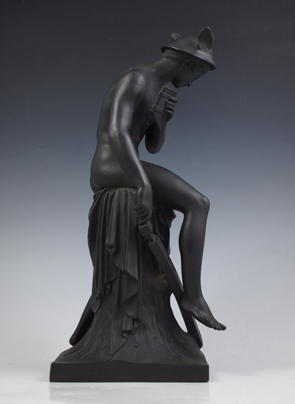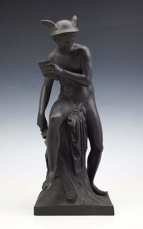 BASALT SCULPTURE OF A YOUNG MERCURY SEATED WITH PAN FLUTE AND SWORD: Unidentified makers mark on the bottom, most likely German or Austrian, 14 1/2''h. From the collection of Banana George Blair.