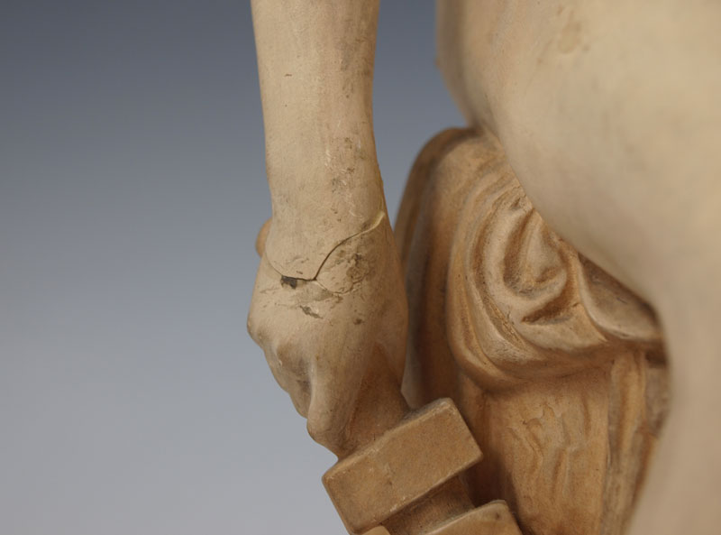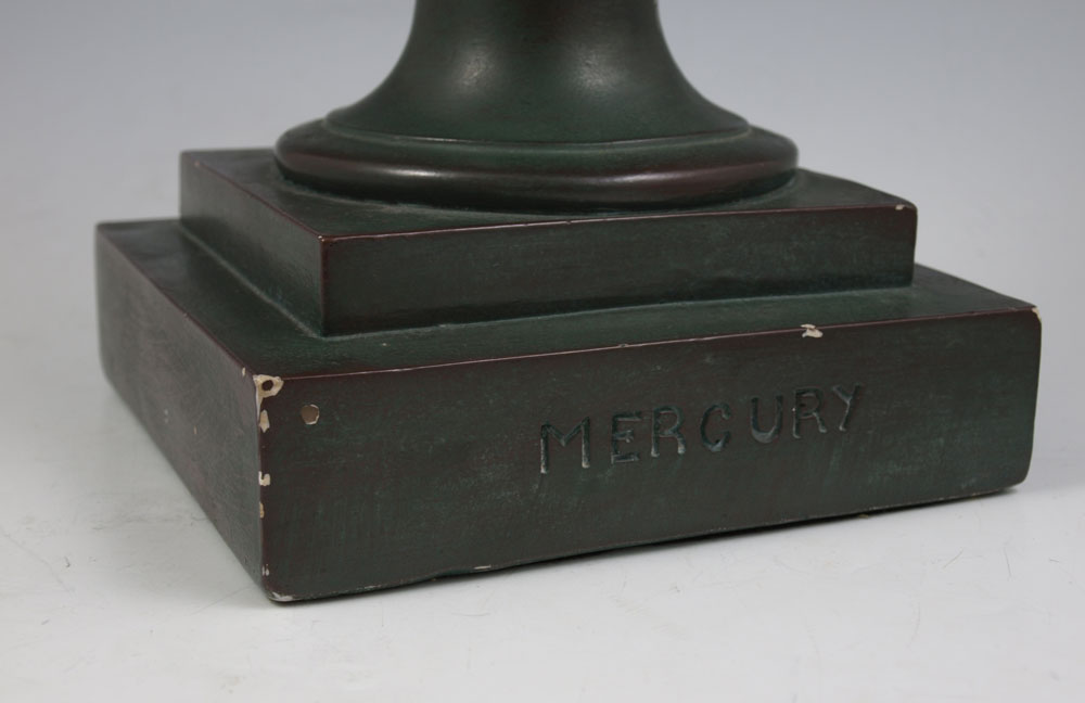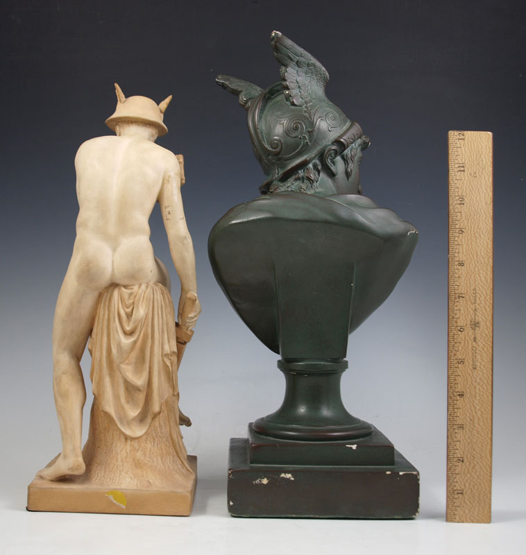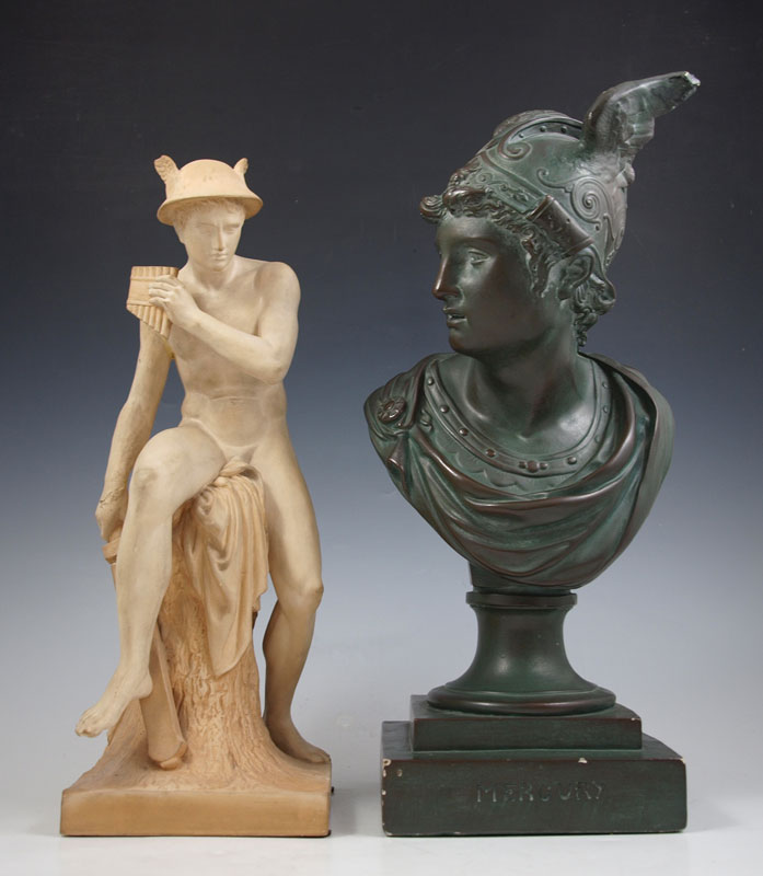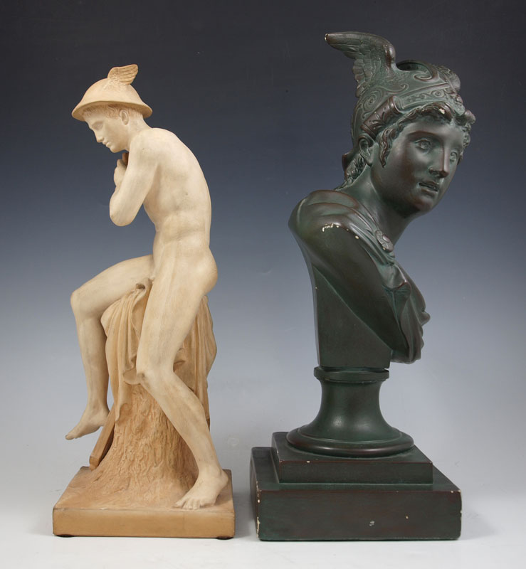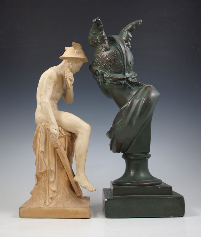 TWO PIECE MERCURY SCULPTURE LOT: First to include painted green chalkware sculpture of Mercury with winged helmet, 16''h. Second to include terracotta sculpture signed Ipsen Copenhagen Ineret, approximately 14''h. From the collection of Banana George Blair.
