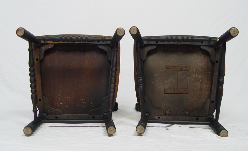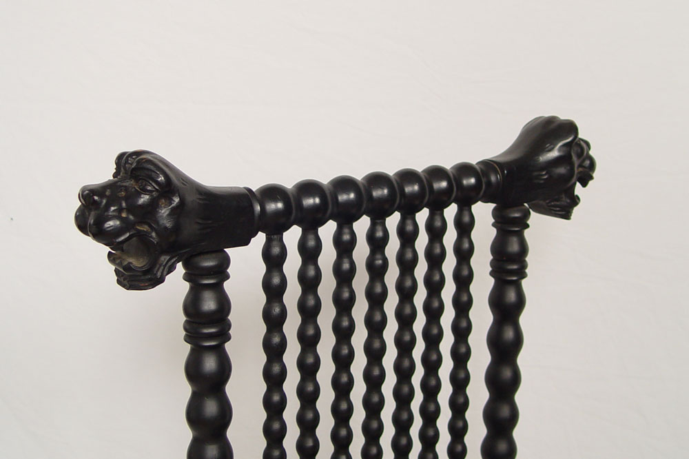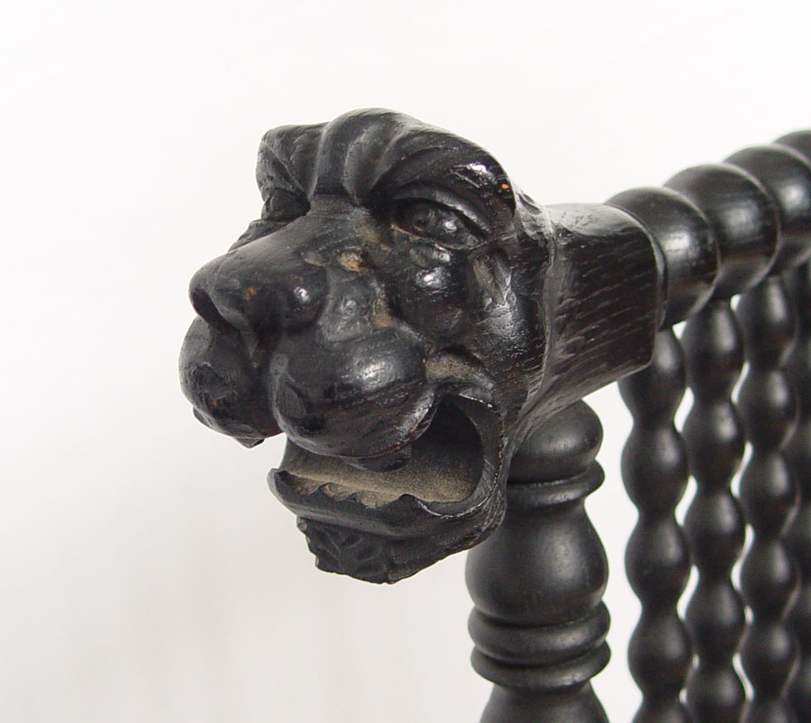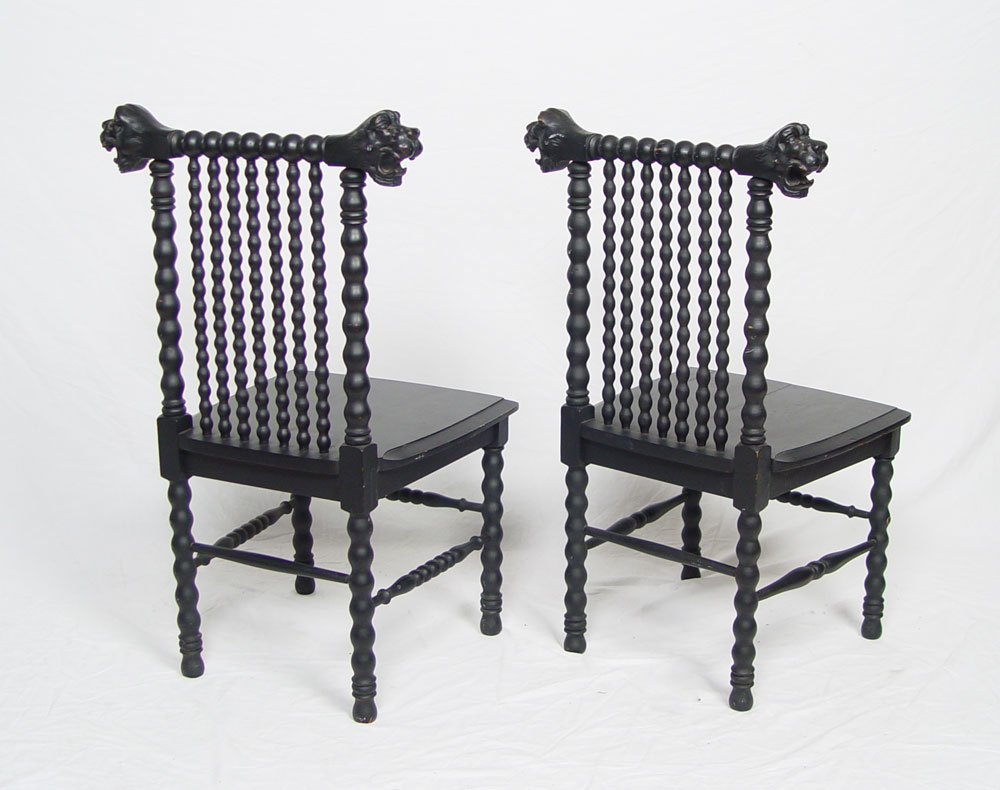 UNUSUAL PAIR OF CARVED LION HEAD CHAIRS: 3 dimensional carved heads on crest. Spool spindle construction, matte black finish with solid plank seats. 37'' h. x 22'' x 19''.