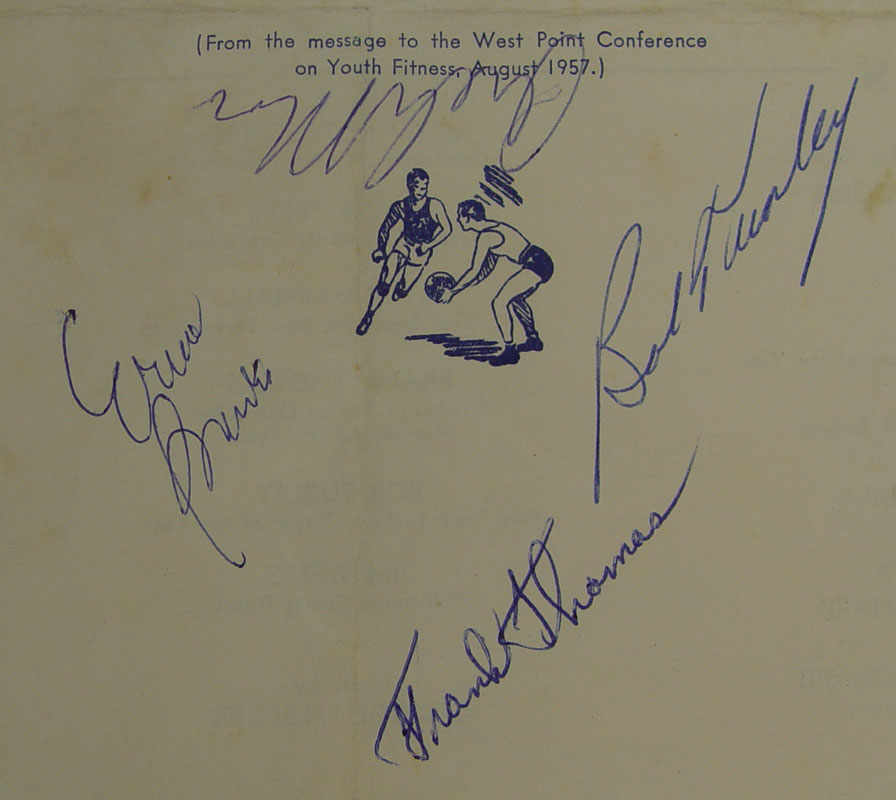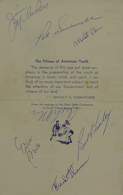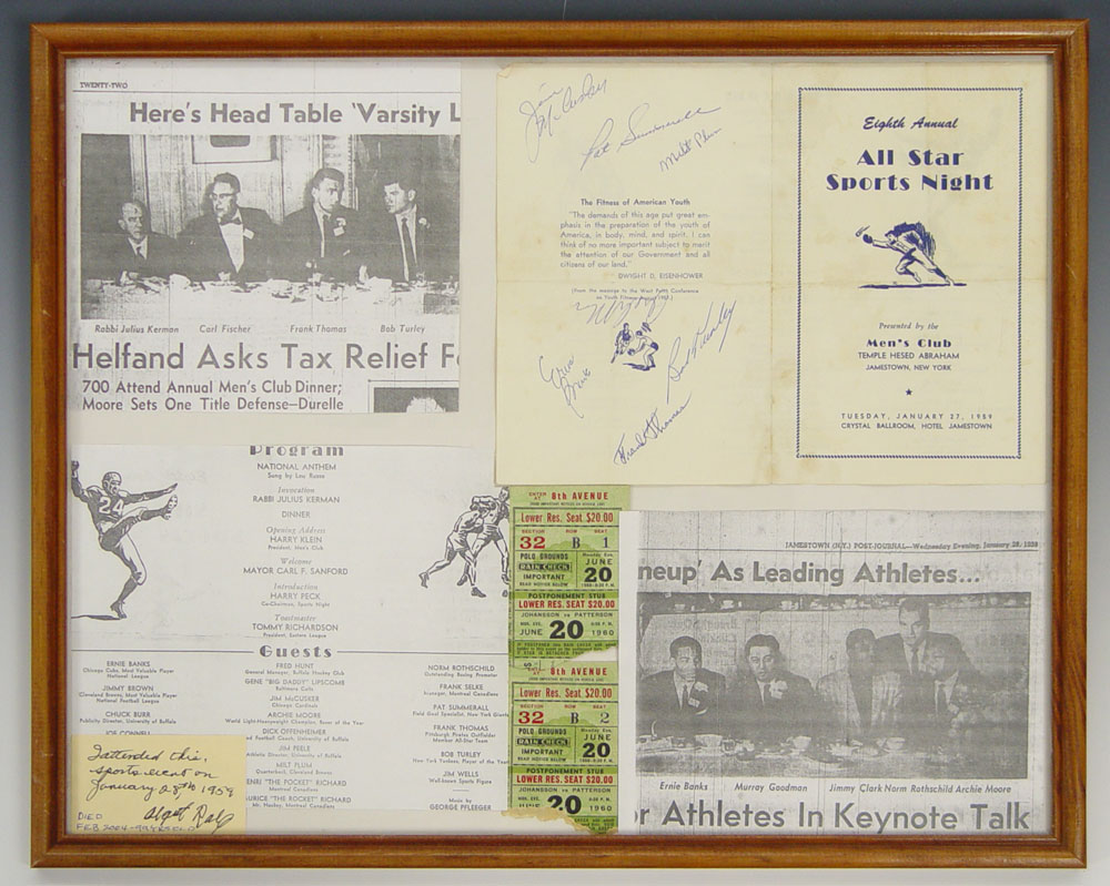 SIGNED SPORTS STARS FRAMED PROGRAM: Autographs of Ernie Banks (Hall of Fame inductee), Archie Moore (Light Heavyweight Champion 1952-1959, 1961), Pat Summerall (Placekicker, Television Sportscaster), Milt Plum (Quarterback), Frank Thomas (3 time All Star), Bob Turley (Cy Young winner), Jim McCusker (Defensive Tackle) all on one program. Comes framed with copies of newspaper article on event. Frame measures 17'' x 21''.