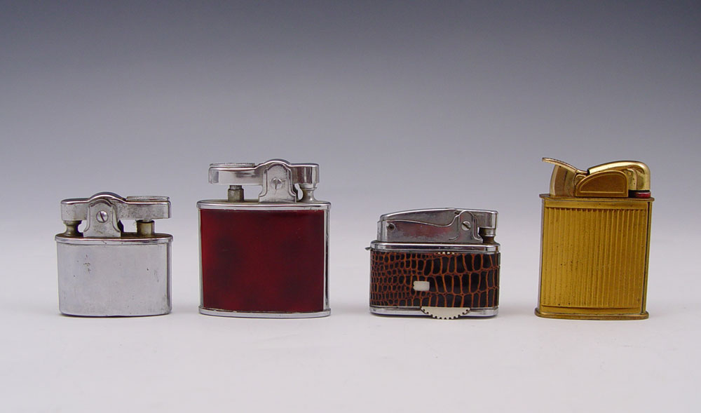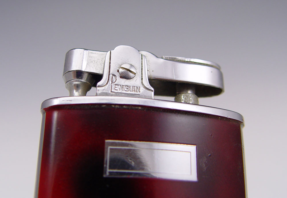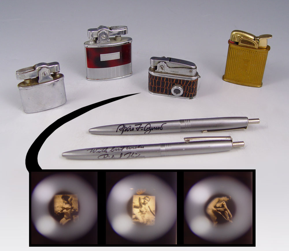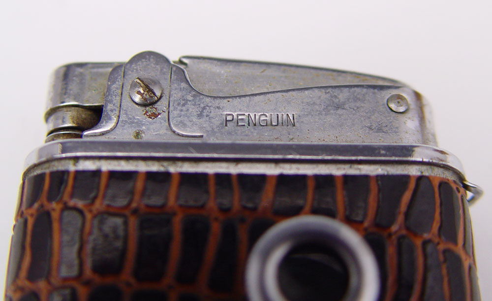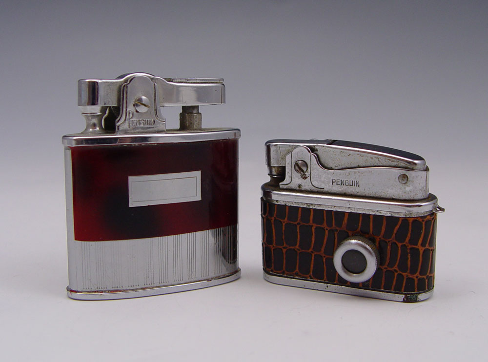 COLLECTIBLE LIGHTER LOT: To include 4 Lighter to include 1) Penguin ''Naughty Lighter'' showing pictures of scantily clad young ladies from the 50's-60's. Alligator skin wrap. 2) Penguin ''Whirlwind''. 3) Unmarked Gold toned lighter. 4) Unmarked silver toned lighter. Sold with Richard Nixon and Spiro Agnew pen set.