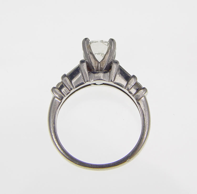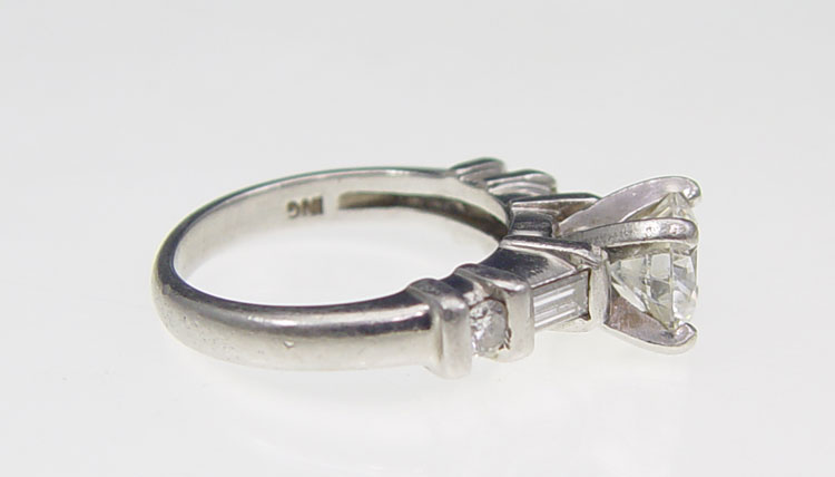 PLATINUM 1.42 CTW DIAMOND ENGAGEMENT RING: Sparkling round brilliant cut diamond of approx. 1.17 Ct., rated near colorless G-H color and SI2 clarity. Flanked by 2 end set tapered baguette diamonds, and 2 bar set bar set round full cut diamonds, all G-H color. Total diamond weight for the ring is approx. 1.42 ctw. Trademark ING. Size 4 1/2, 7.4 grams.