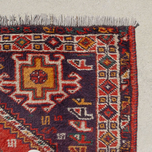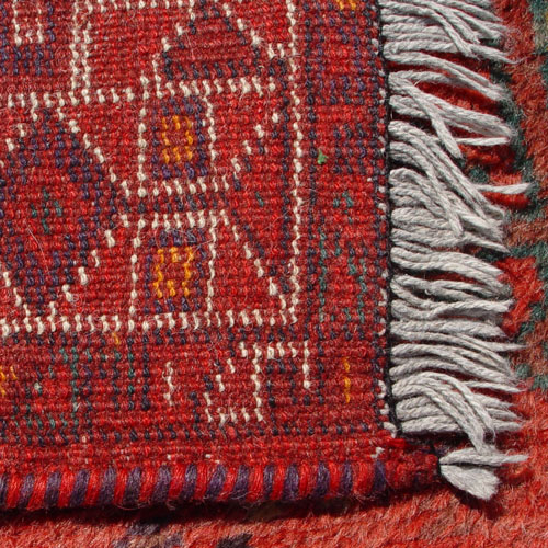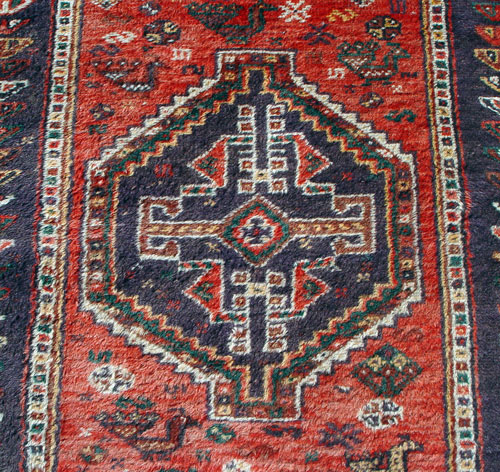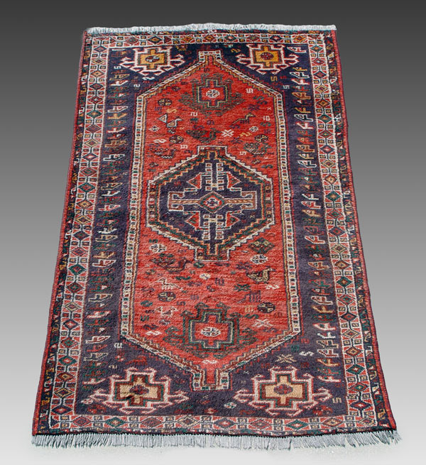HAND TIED RUG: Approx. 7' 10 1/2'' x 4' 9 1/2'', red ground with multi color borders, center blue medallion.
