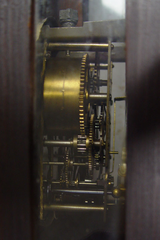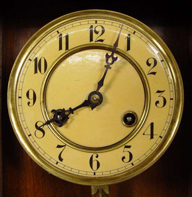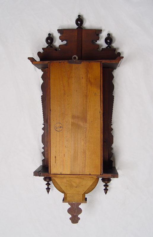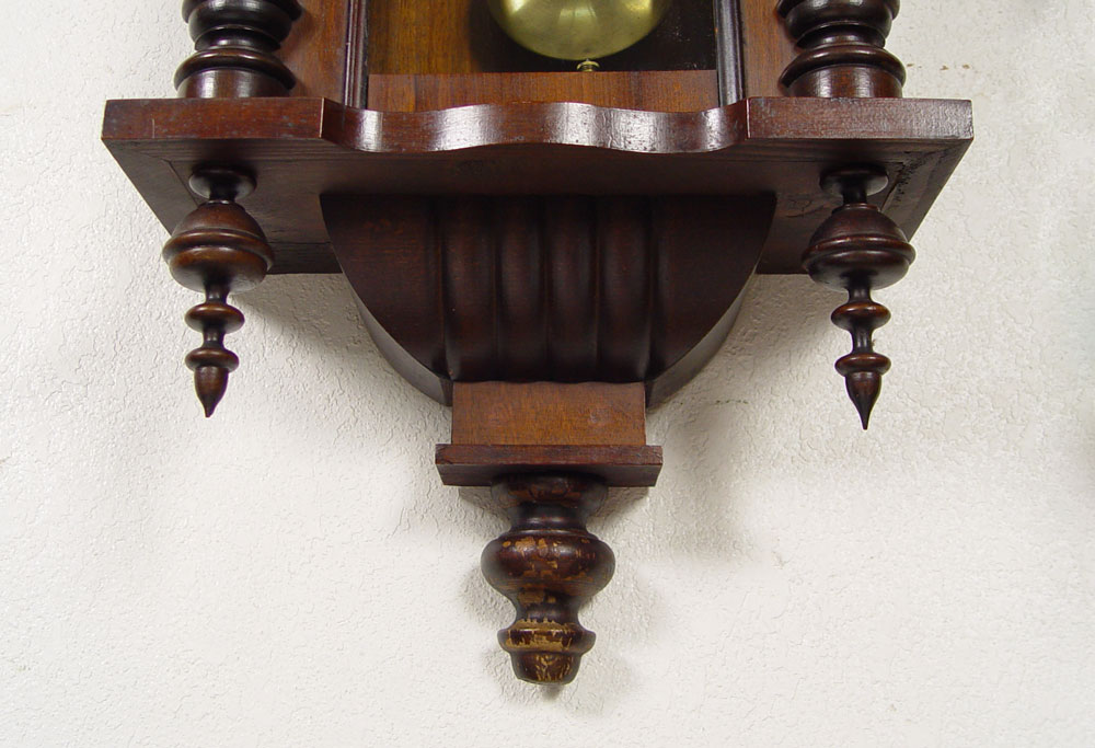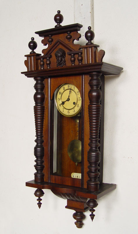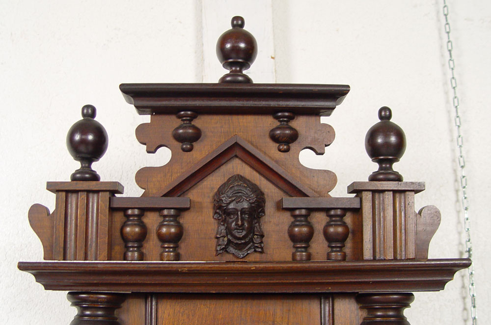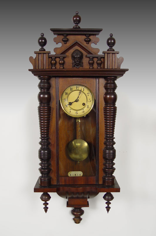 EUROPEAN CARVED WALL CLOCK: Most likely German with carved half columns, architectural pediment with applied masqueron and ball spire finials. Celluloid face with Arabic numerals, time & Strike movement. Pendulum in case, key in office. Approx 34'' h. x 16 3/4'' x 7''.