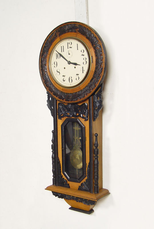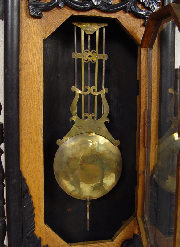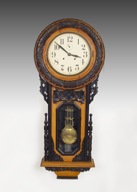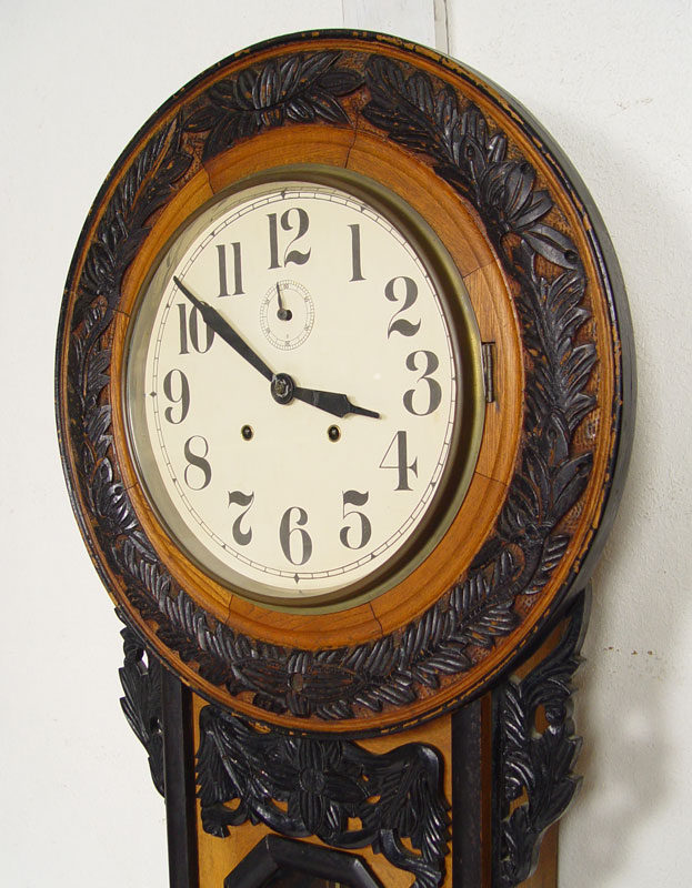 LARGE CARVED EUROPEAN WALL CLOCK: European walnut case with carved and applied decoration with black painted finish. Unsigned time and strike movement. Paper over metal dial with Arabic numerals. Approx. 48 3/4'' x 20 1/4'' 5 3/4''.