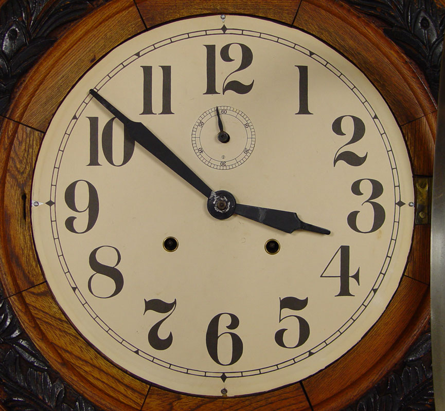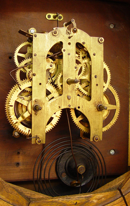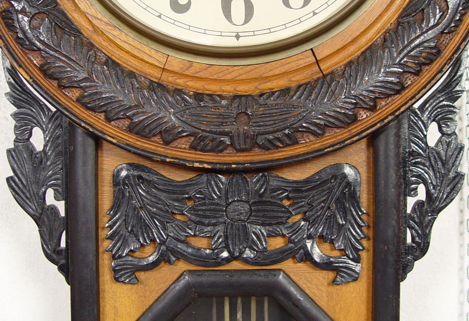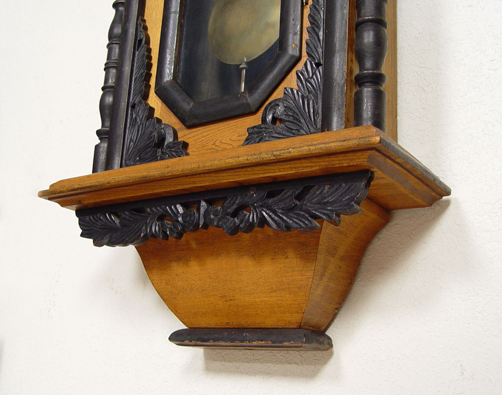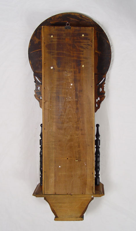 CONDITION: Note age slits between wood sections on bezel, loss of paint decoration, minor loss of paper on dial.