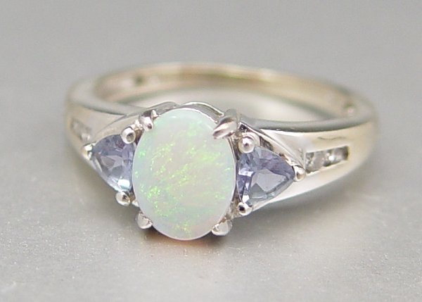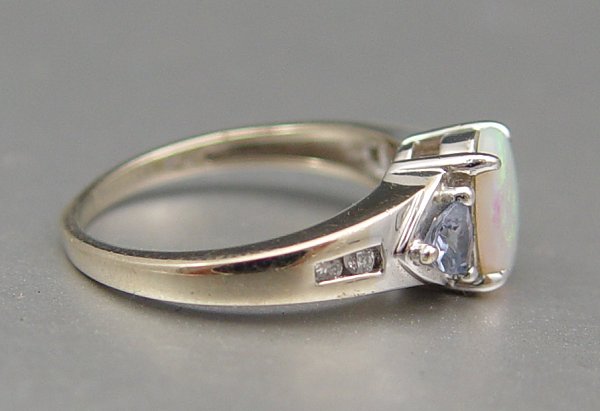 14K OPAL, TANZANITE AND DIAMOND RING: 14K white gold ring contains one oval cabochon cut opal. WEIGHT: .50 Ct. Approx. Blue/Green play-of-color. Two triangle shaped tanzanite. WEIGHT: .25 Ct. Approx. Four round brilliant cut diamonds. WEIGHT: .06 Ct. Approx. The gemstones are prong set. Weight: 3.0 grams. Size: 6