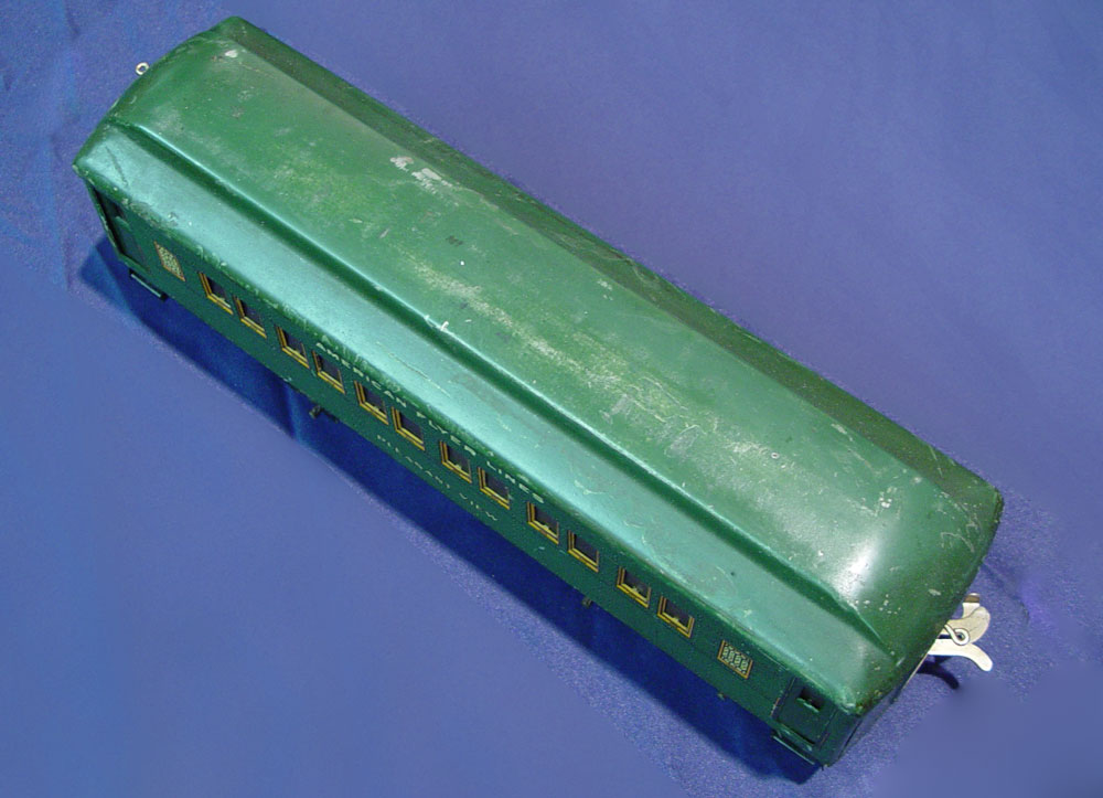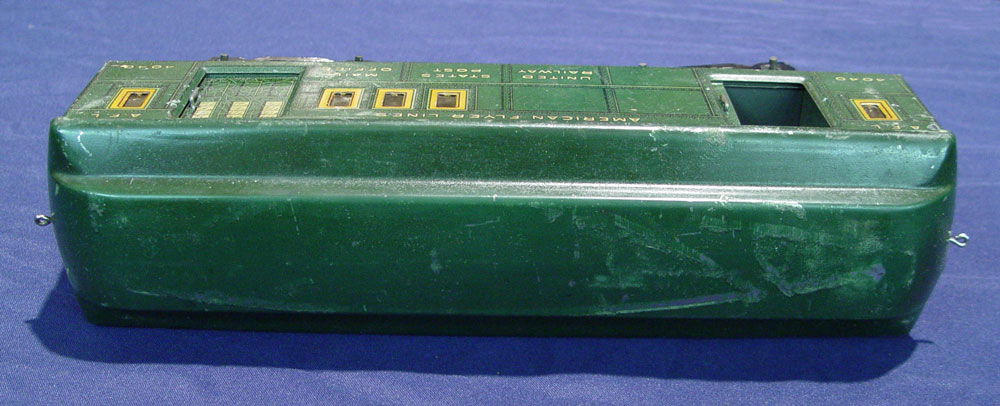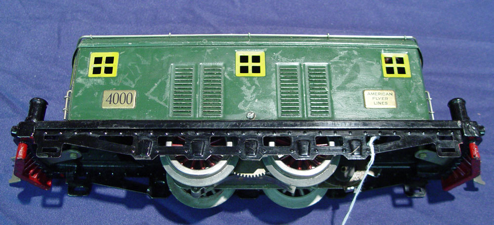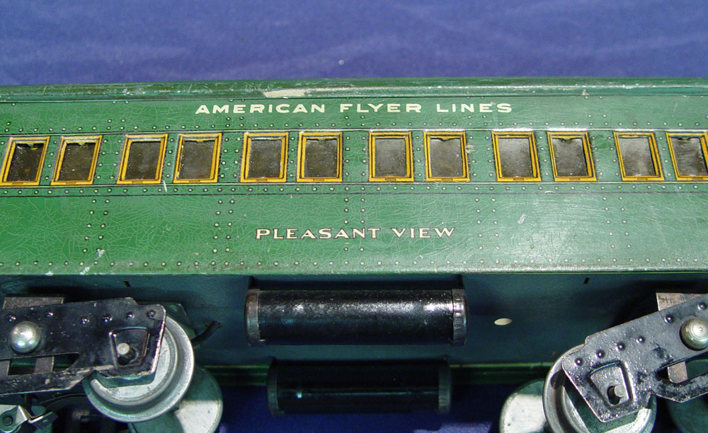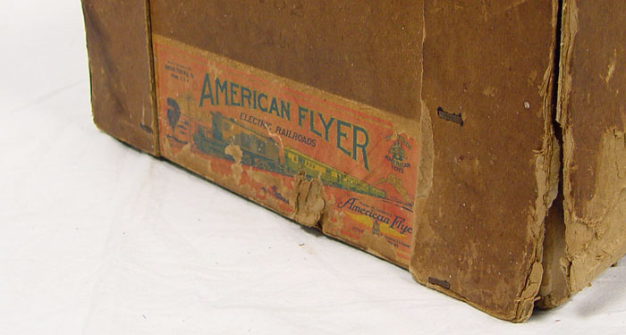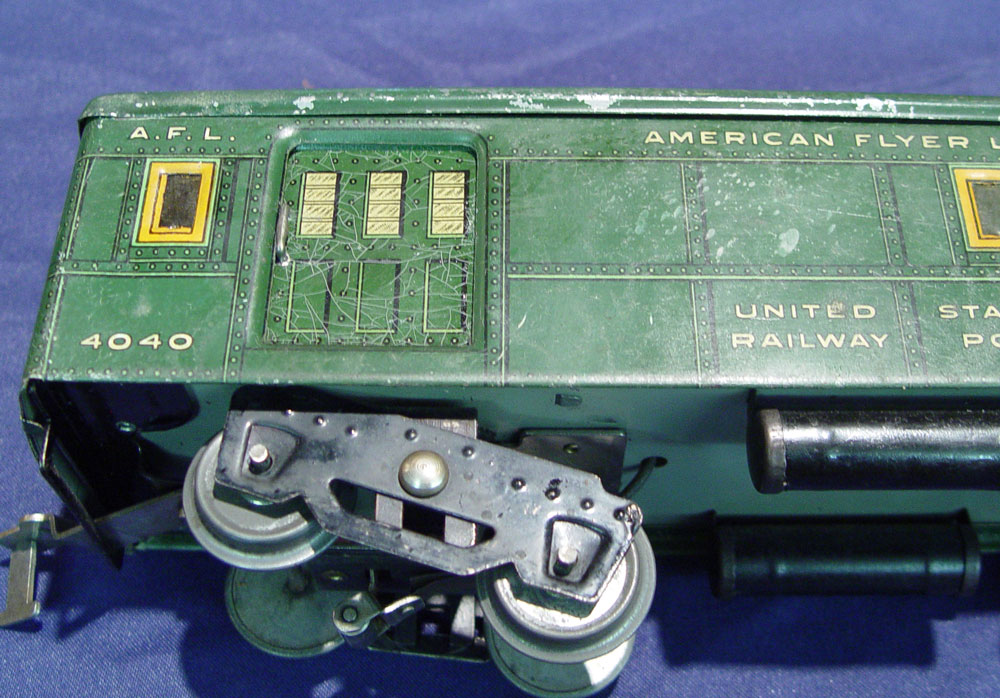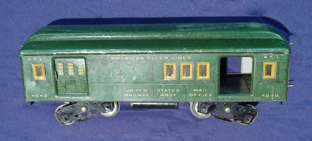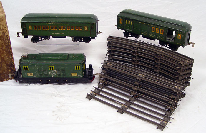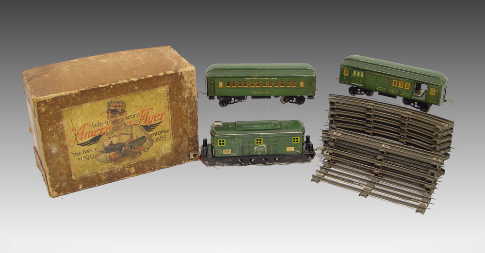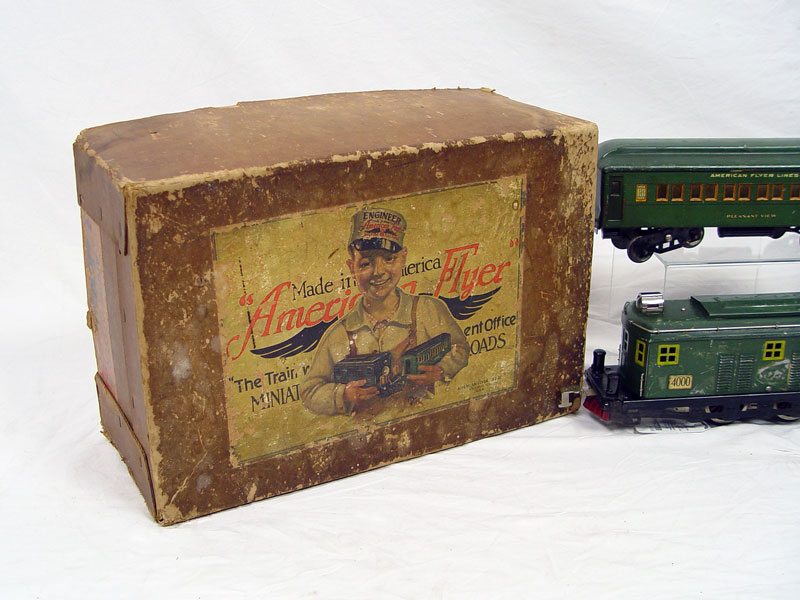 PRE WAR AMERICAN FLYER 4000 TRAIN WITH ORIGINAL BOX: All Dark green color to include 4000 locomotive, 4040 United States Mail car, 4041 Pleasant View passenger car. Sold with 14 original track pieces and original box with decals. Box measures 8'' h. x 19'' x 13''.