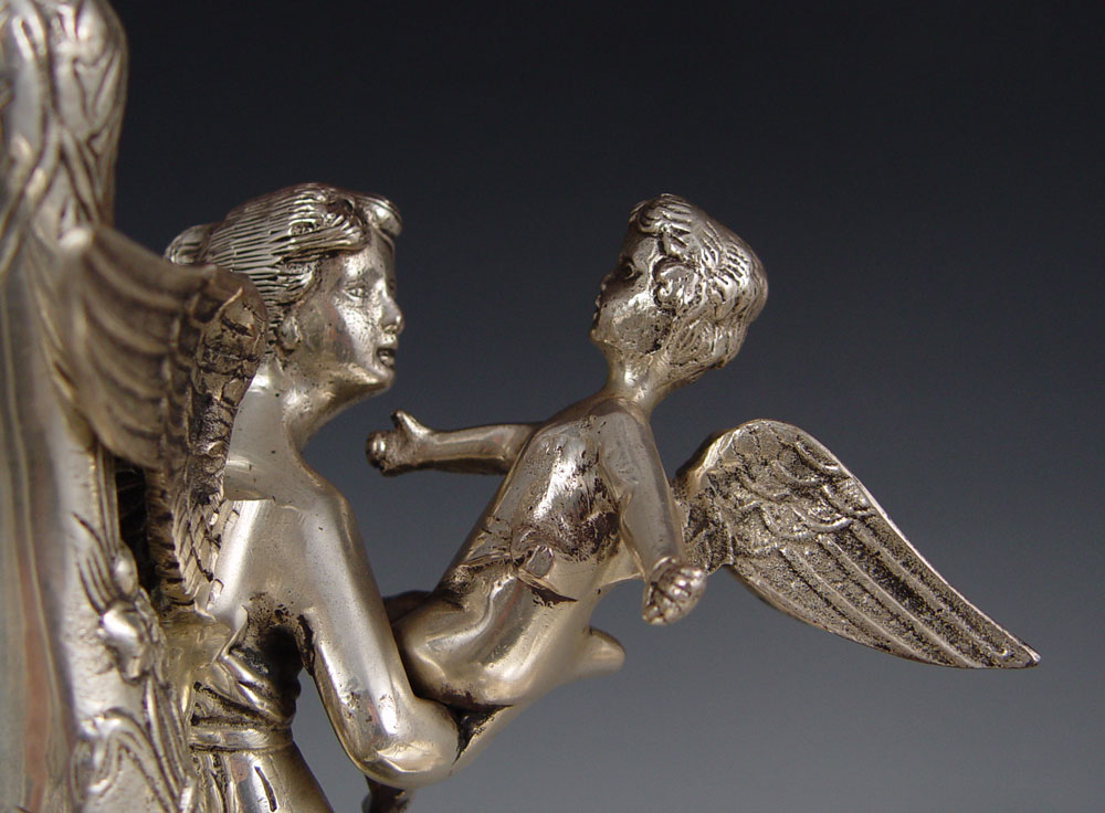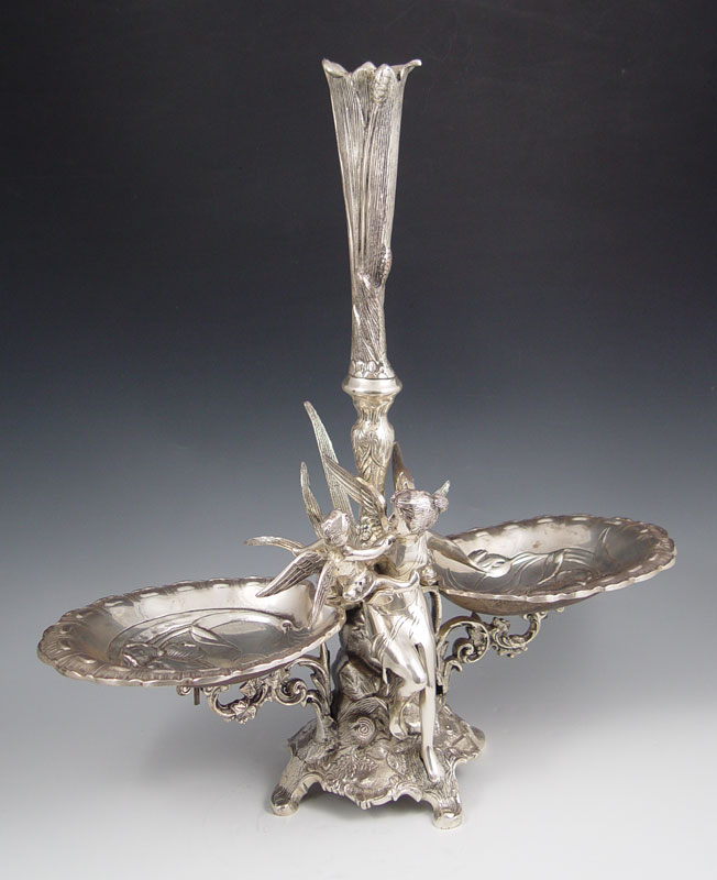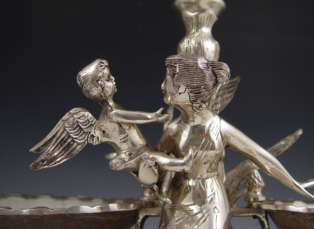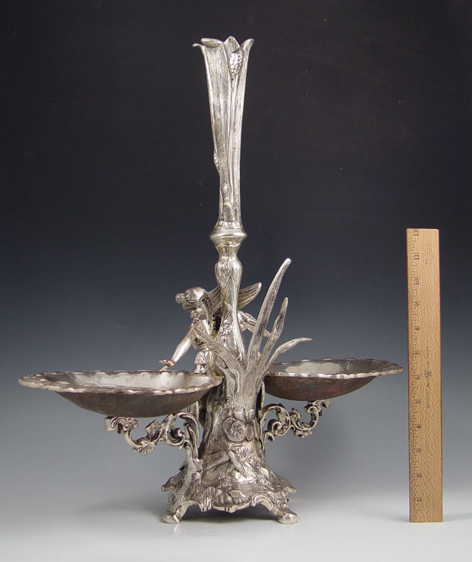 FIGURAL VICTORIAN STYLE SILVERPLATE EPERGNE: Double bowl epergne with bud vase top and figural angel with cherub on tree form base. Unmarked as to maker. 20 1/2'' h. x 19 1/2'' x 8''.