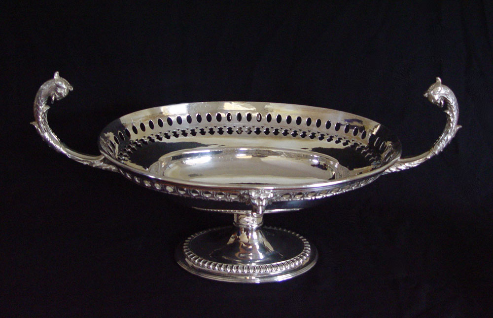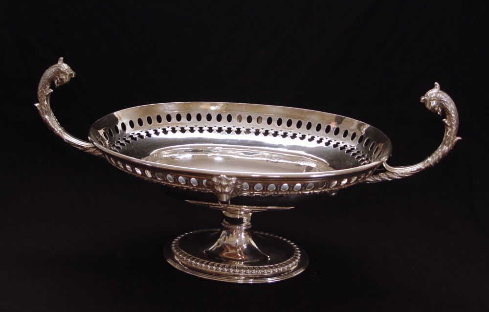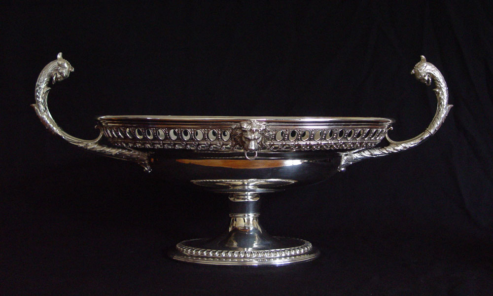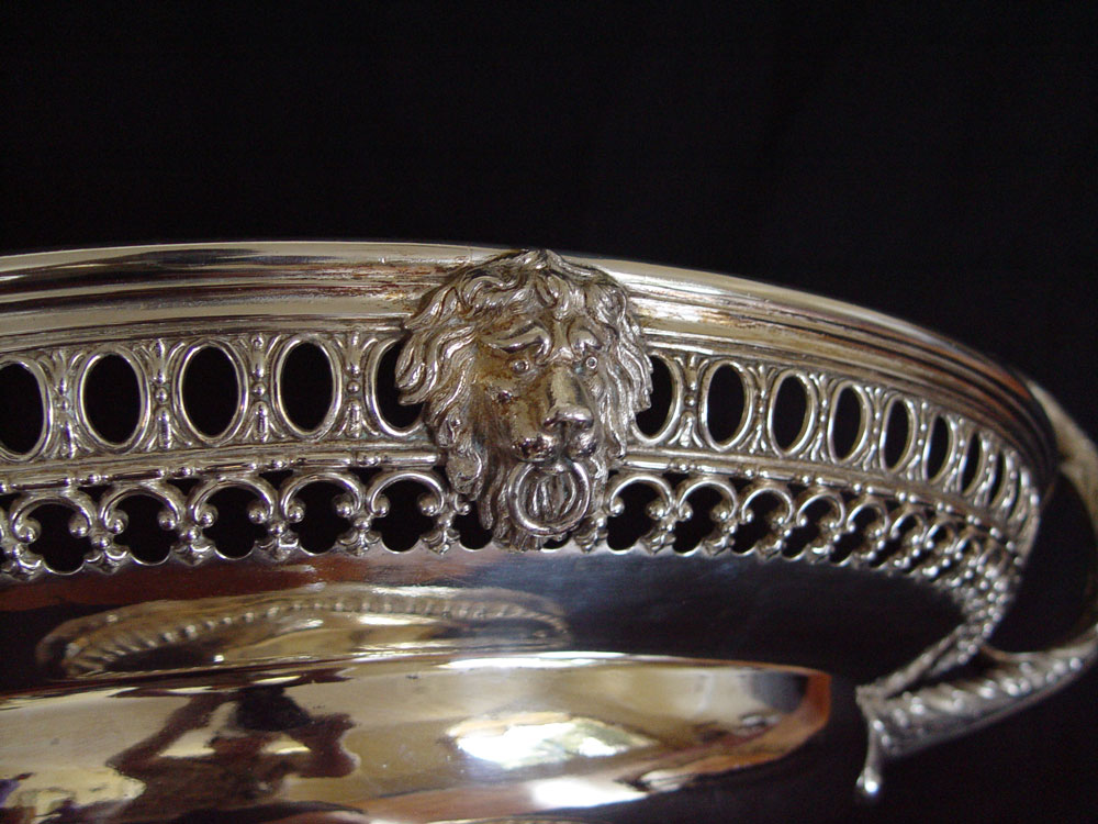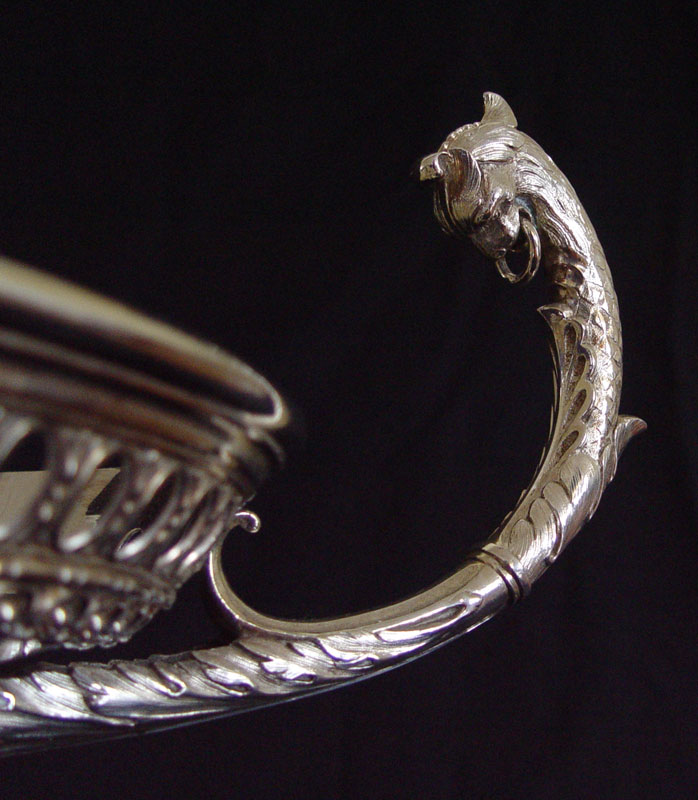 LARGE LION HEAD CENTER BOWL: Open work bowl with applied lion masquerons, 2 figural handles. Unmarked as to maker. 12'' h. x 26 7/8'' x 13''.