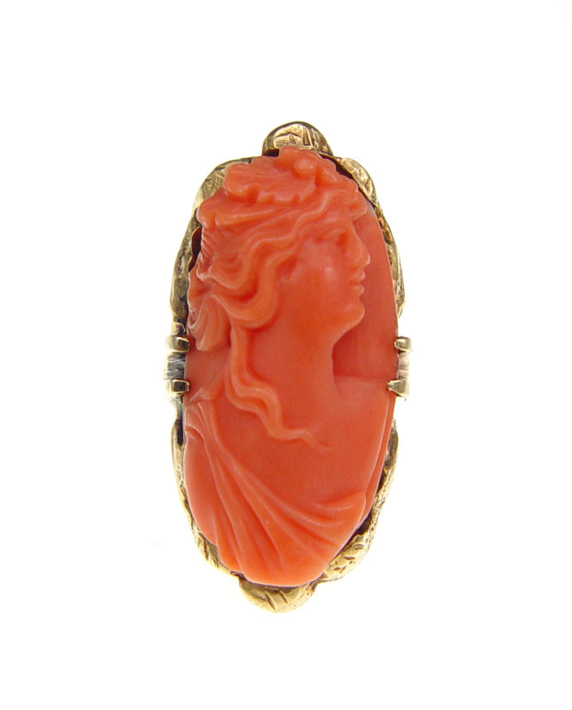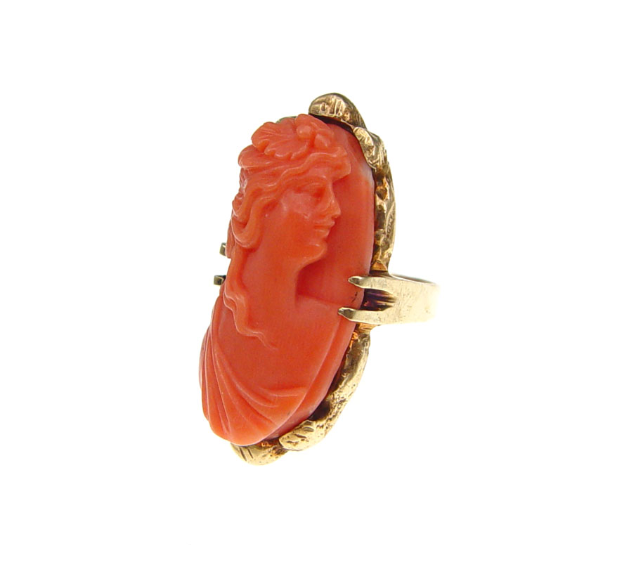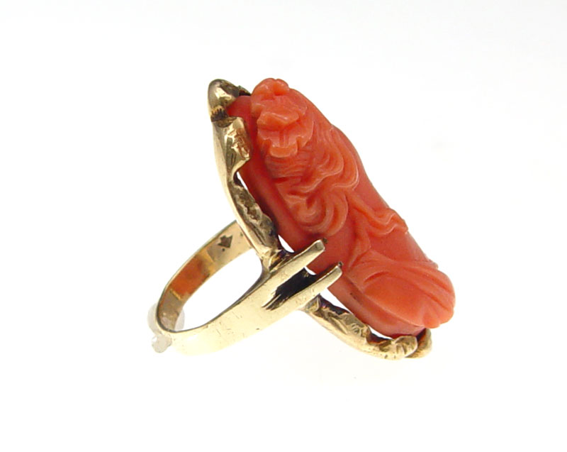 CARVED CORAL CAMEO RING: 10K yellow gold ring contains one oval shaped carved coral cameo. The cameo is approx. 1''L. Weight: 6.0 grams. Size:3