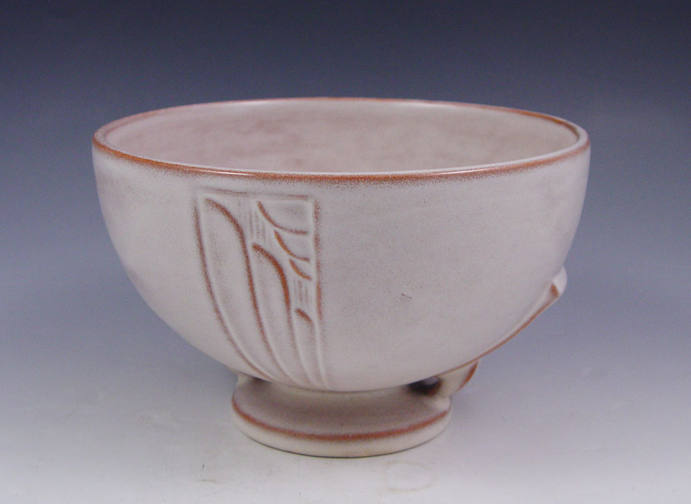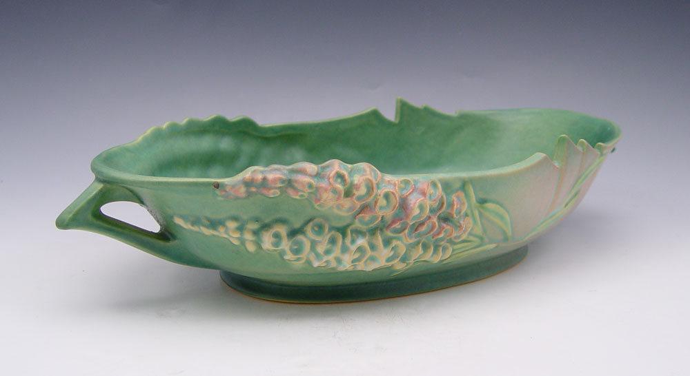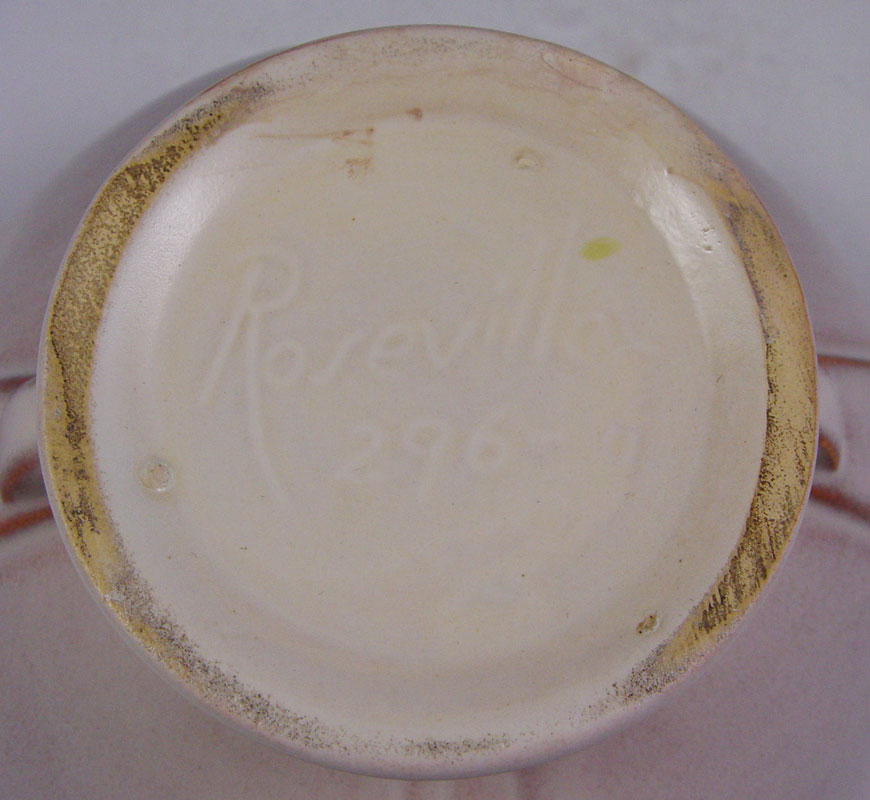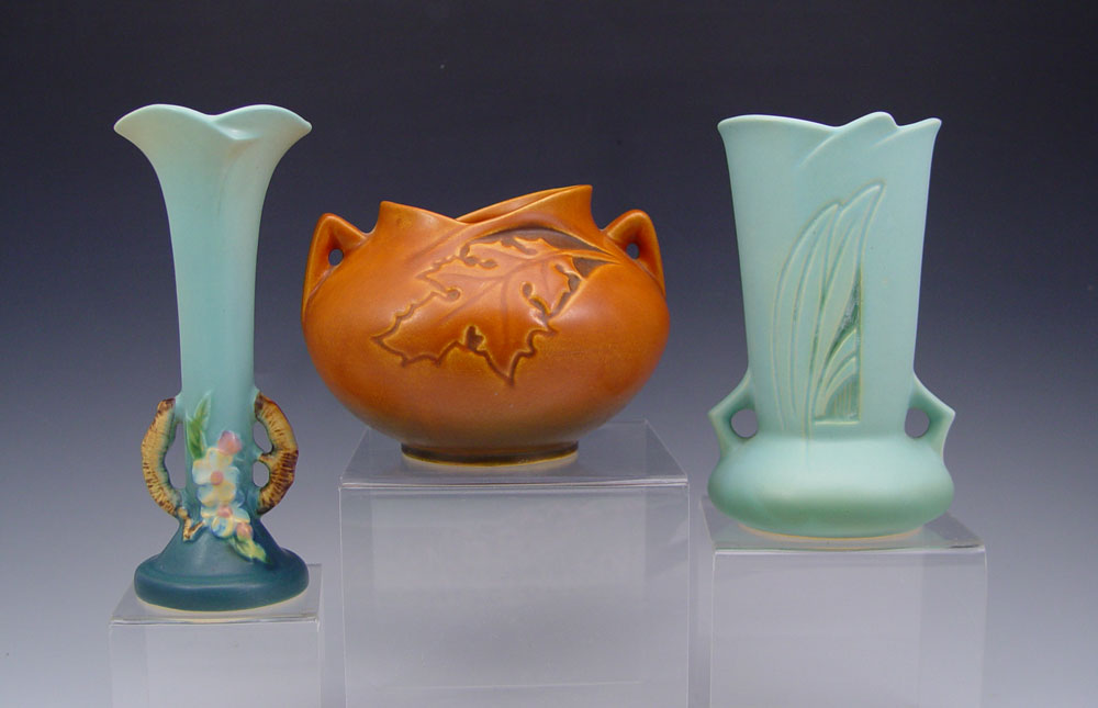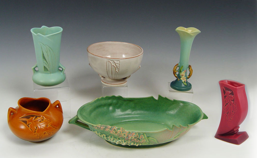 ROSEVILLE POTTERY GROUP: 6 pieces to include 1) Silhouette 296-6 white, 4 3/8'' x 6 3/4''. 2) Silhouette 781-6 plum, 6 1/4'' h. 3) Silhouette 741-4 orange, 4 1/8'' h. x 5 1/2''. 4) Silhouette 780-6 light blue, 6 1/4''. 5) Foxglove 423-12 pink and green, 3'' h. x 15 1/4'' x 7 1/2''. 6) Apple Blossom 379-7 bud vase, 7 5/8''.