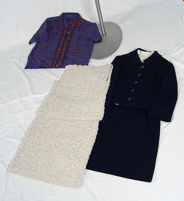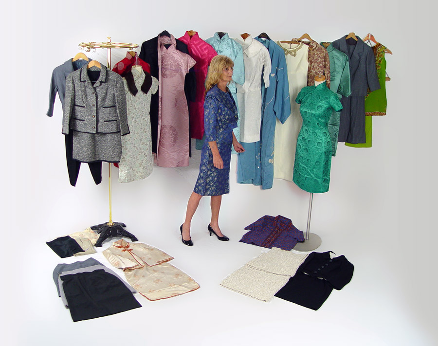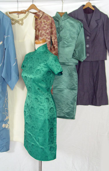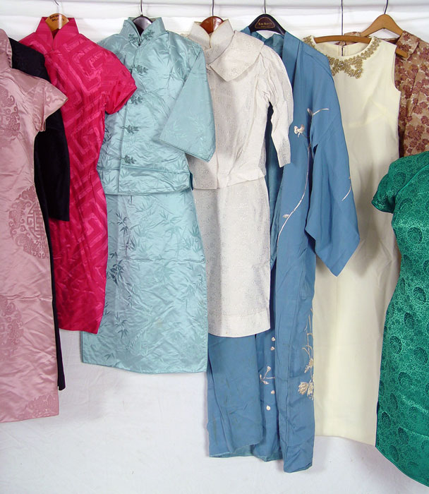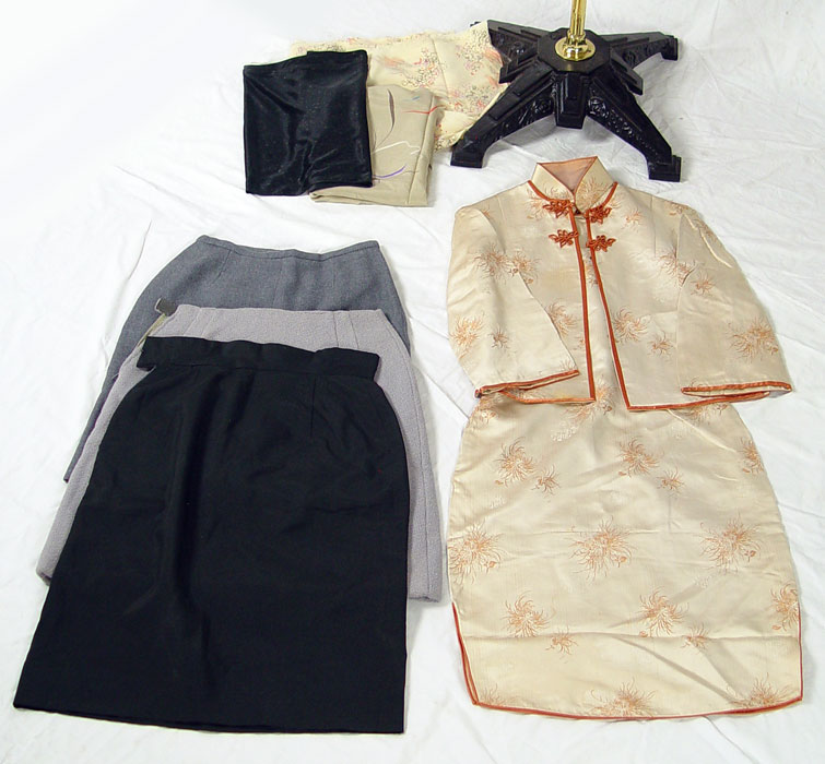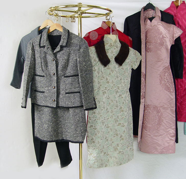 A WARDROBE OF FINELY MADE LADIES OUTFITS: Approx. 46 pieces to include Chinese style dresses with jackets, skirt suits, blouses with matched pants, robes, 3 skeens of fabric, etc. Approx. sizes 1-3.