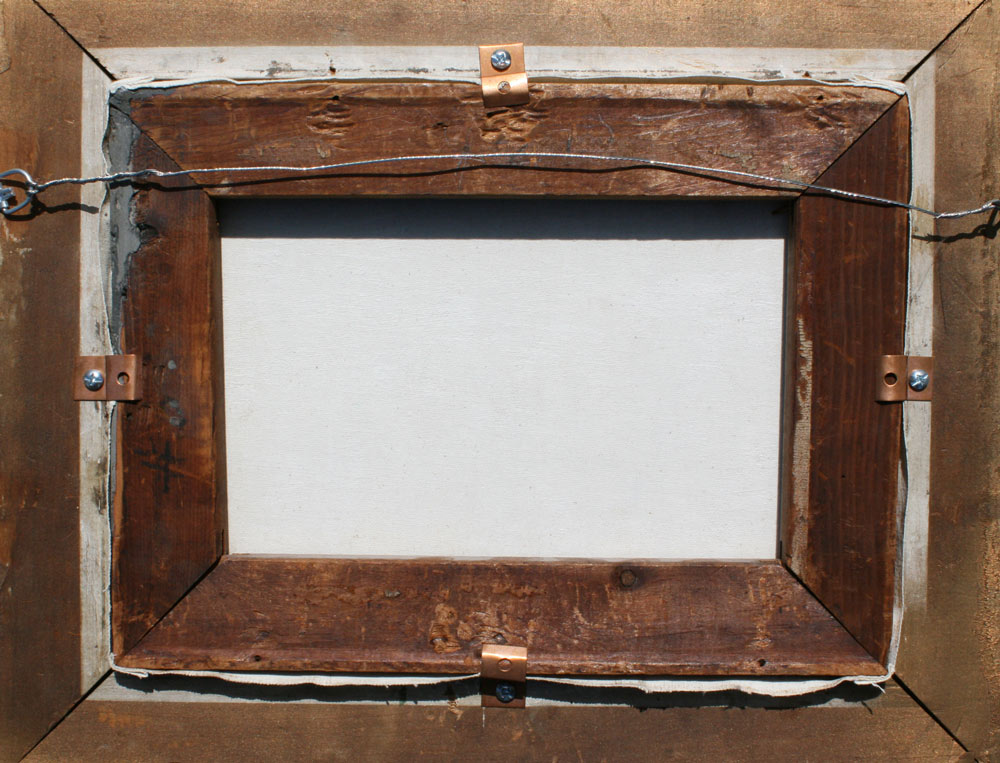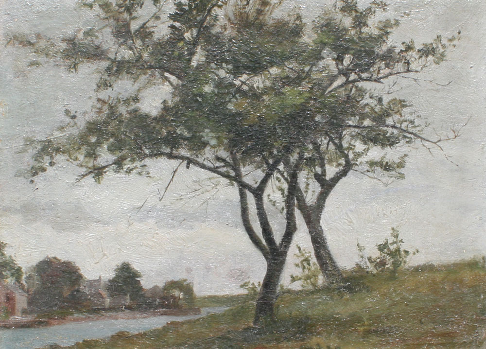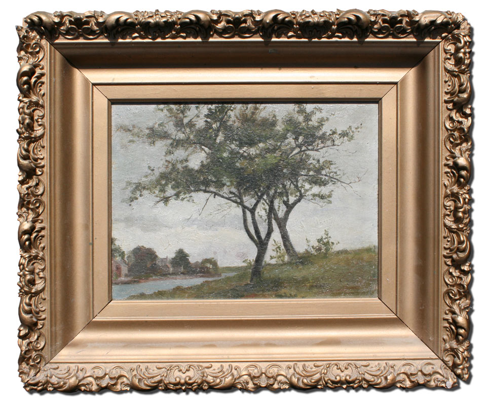 BARBIZON LANDSCAPE WITH VILLAGE AND STREAM C 1900: OIL/Canvas, 9'' x 12'', vintage frame with wear and overpaint, 15 1/2'' x 18 1/2''