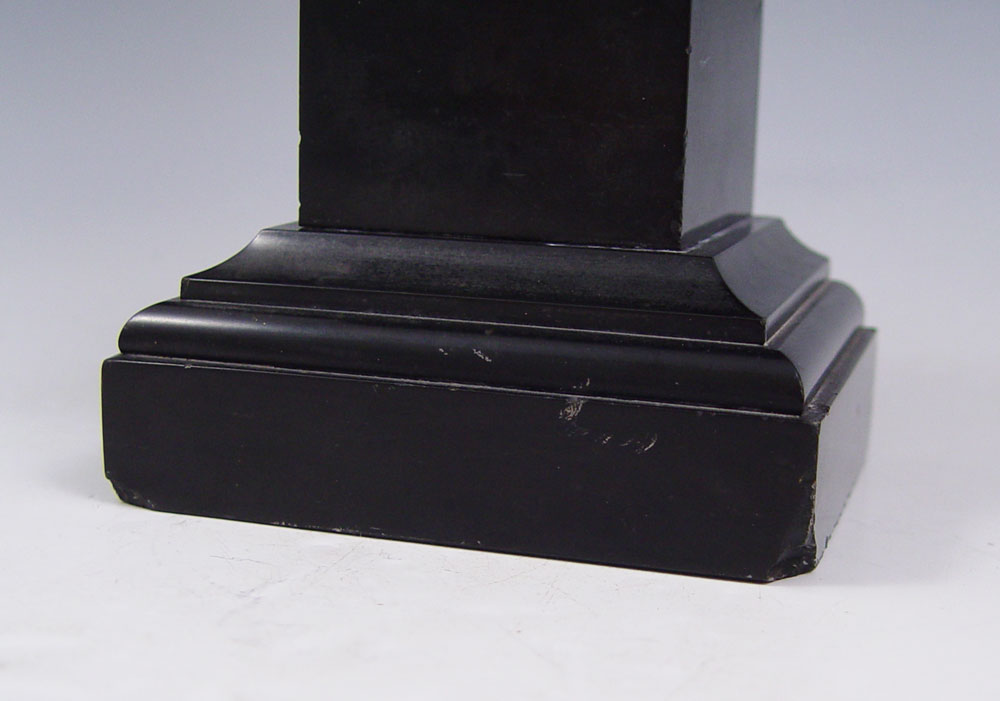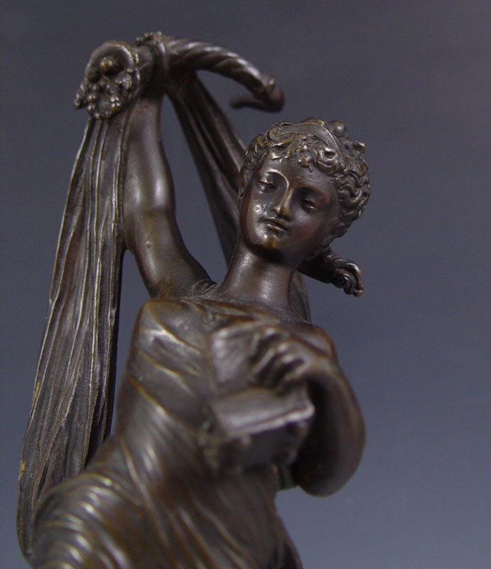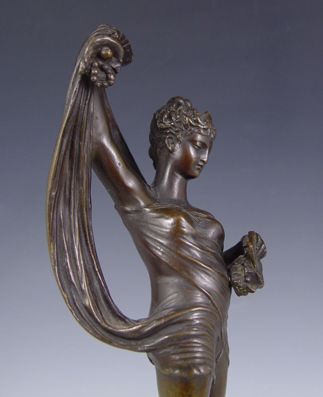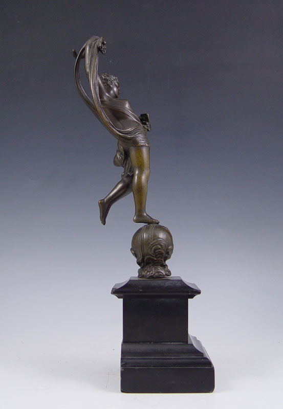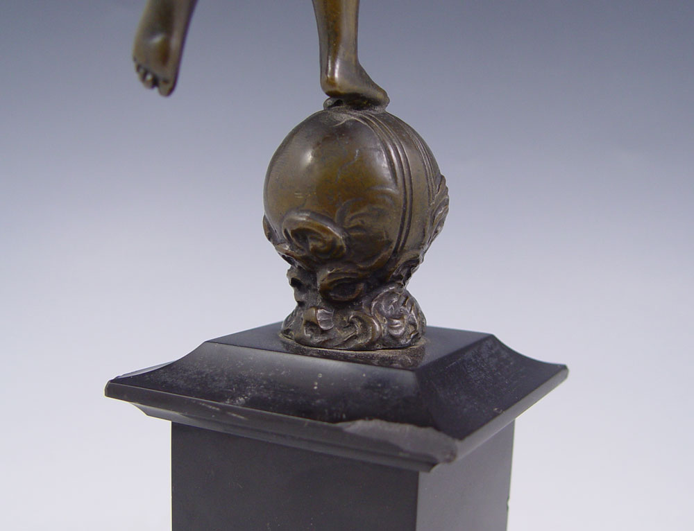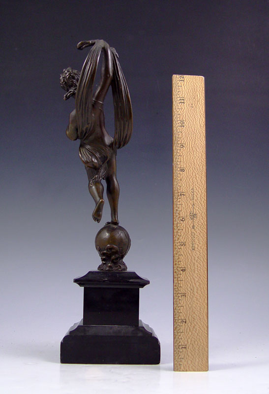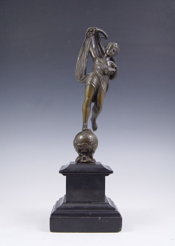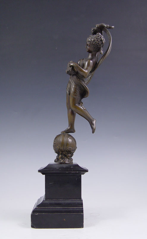 LATE 19TH/EARLY 20TH CENTURY BRONZE OF PANDORA HOLDING HAND UPWARDS WITH FOOT ON ORB: Approximately 9 1/2''h, no visible signature, affixed to multi-piece beveled marble plinth, 13 1/2'' h. From the collection of Banana George Blair.