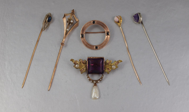 SIX ANTIQUE 10K GOLD PINS: Lot of 6 10K pins. Pins contain seed pearls, amethyst, sapphire, coral, and diamond. Weight: 10.1 grams.