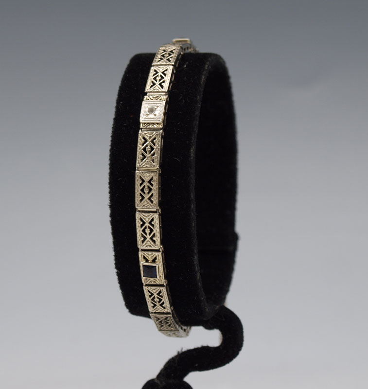 10K DIAMOND FILIGREE BRACELET: 10K white gold filigree bracelet contains one round single cut diamond. WEIGHT: .01 Ct. Approx. Two square sapphires of unknown origin. WEIGHT: .25 Ct. Approx. The sapphires are bezel set. The diamonds are bead set. Locking closure with safety chain. Weight: 6.8 grams. Length: 7''