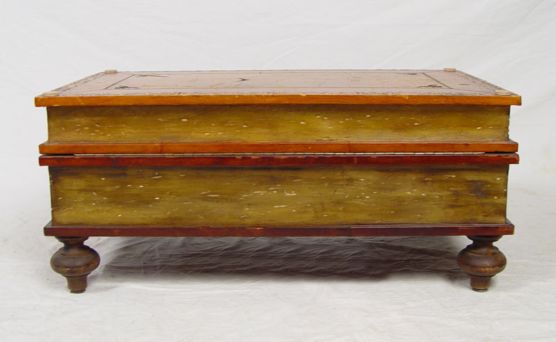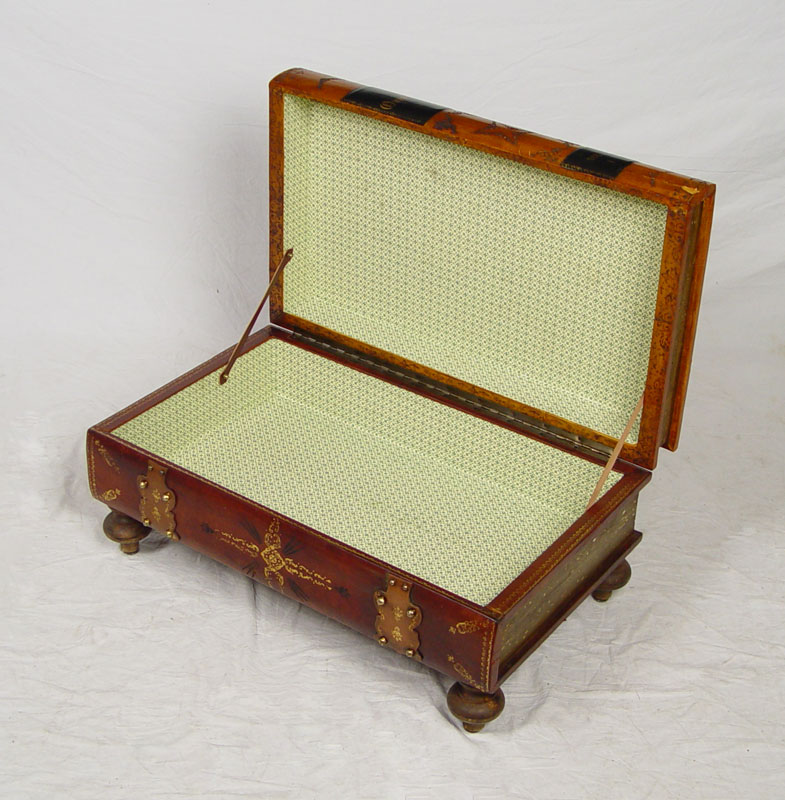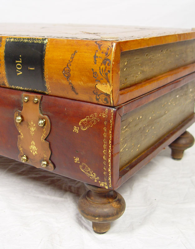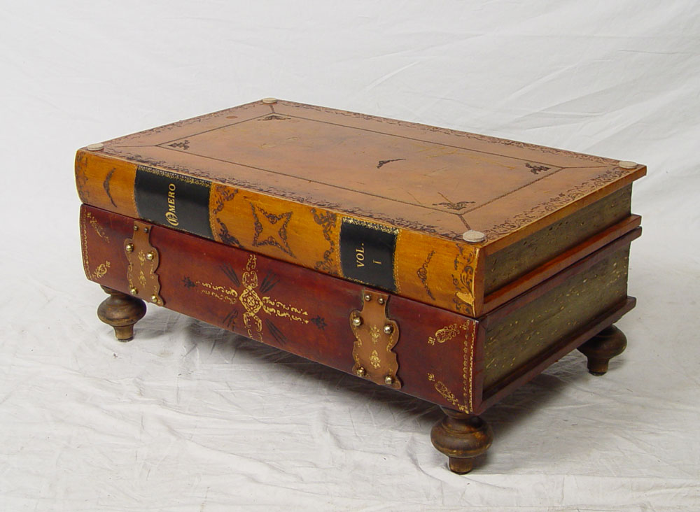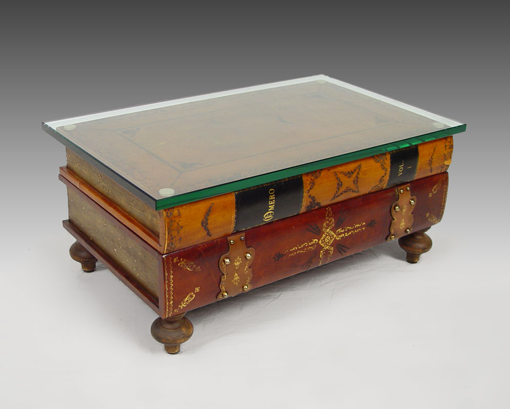 COFFEE TABLE IN THE SHAPE OF BOOKS: Body is in the form of 2 large leather bound books, heavy glass top. Measures 13 3/4'' h. x 30 3/4'' x 19''.