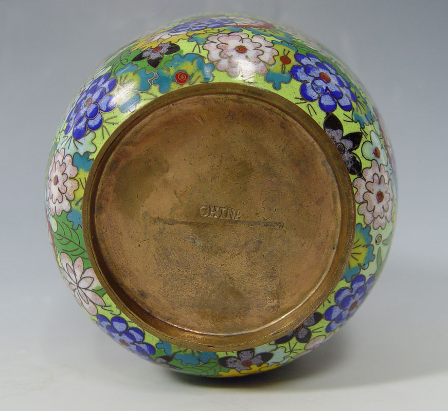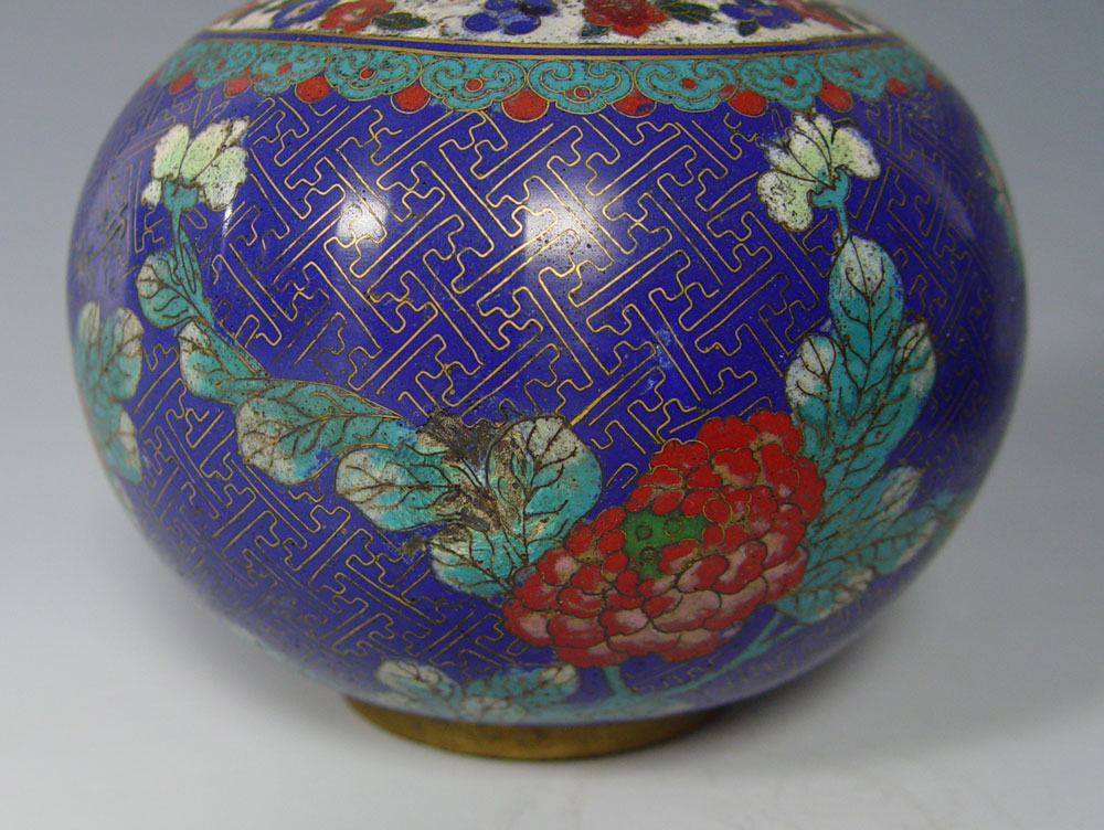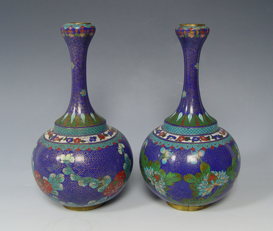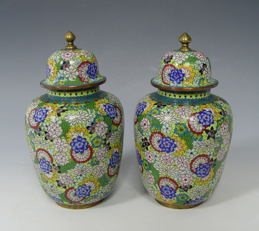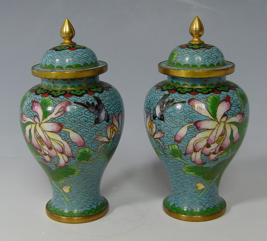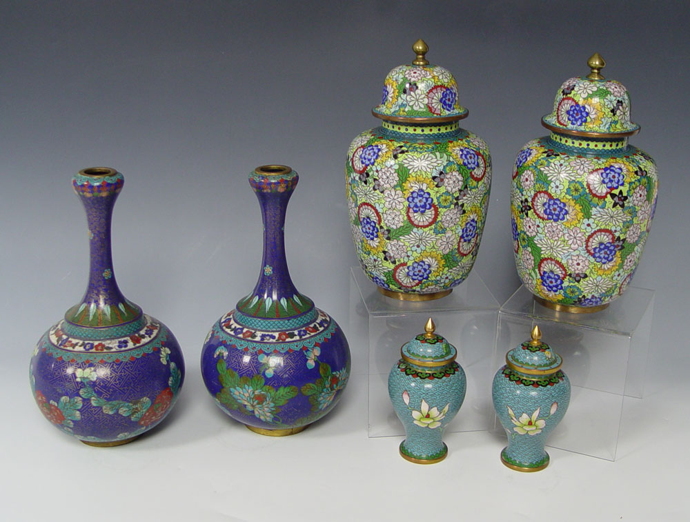 3 PAIRS CHINESE CLOISONNE VASES AND JARS: 1) Pair of blue ground bottle neck vases, 10'' tall. 2) Pair covered ginger jars, one with a mar, 9 1/2'' tall. 3) Small pair of covered ginger jars, 5 1/2''.