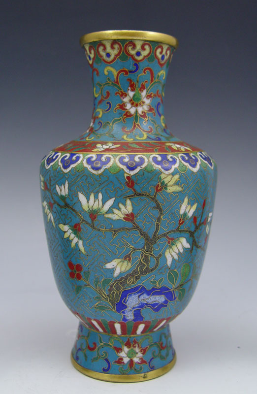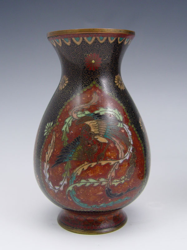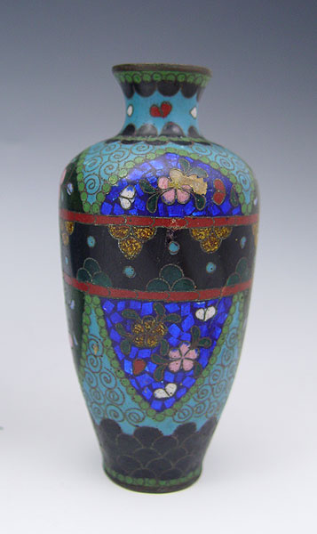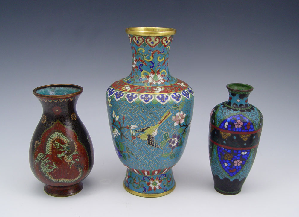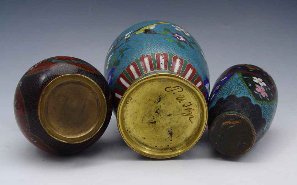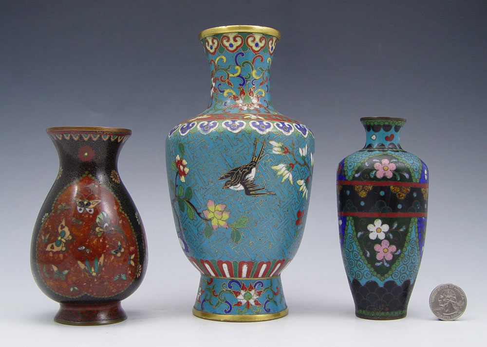 GROUP OF 3 CLOISONNE VASES: 1) A 7'' vase signed in script PU JKZR. 2) Ginbari vase with dragon, butterflies, and phoenix bird, 5''. 3) A 5 1/2'' Japanese vase with a ginbari reserve.
