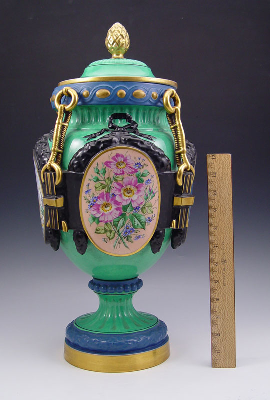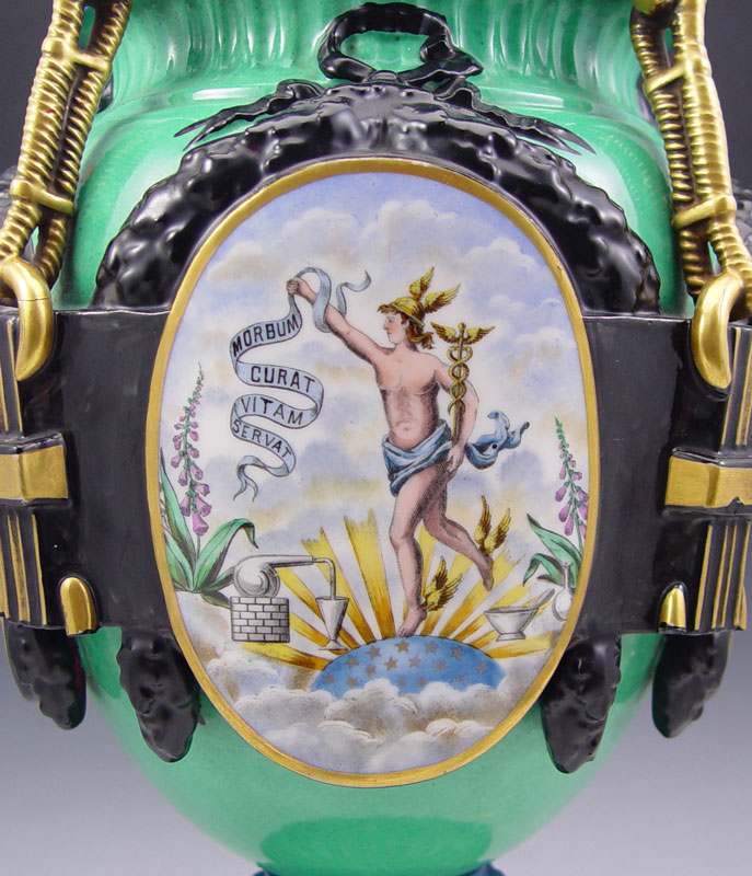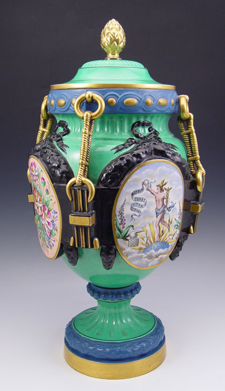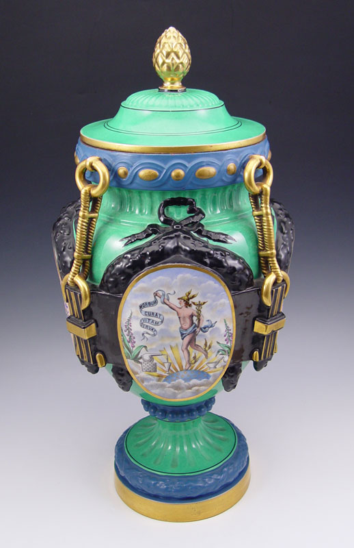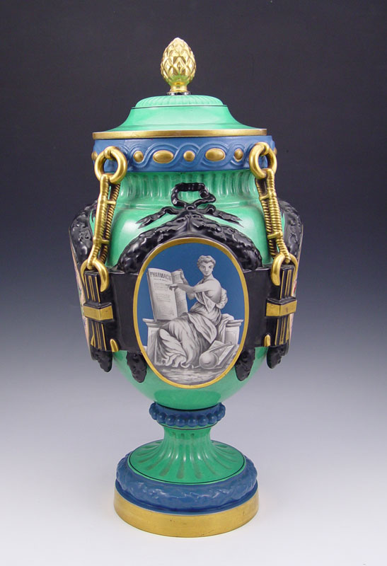 PARIS PORCELAIN APOTHECARY JAR: Panel vignettes of Mercury, floral decoration, and Pharmacie list. 20 1/2'' to top of lid x 11''. From the collection of Banana George Blair.