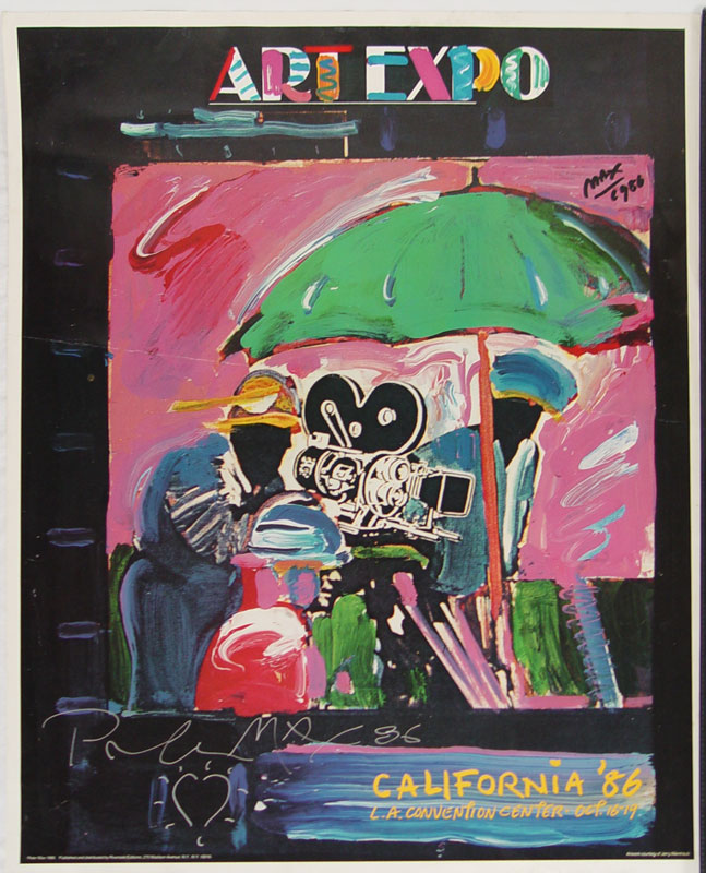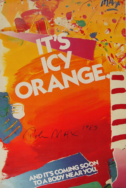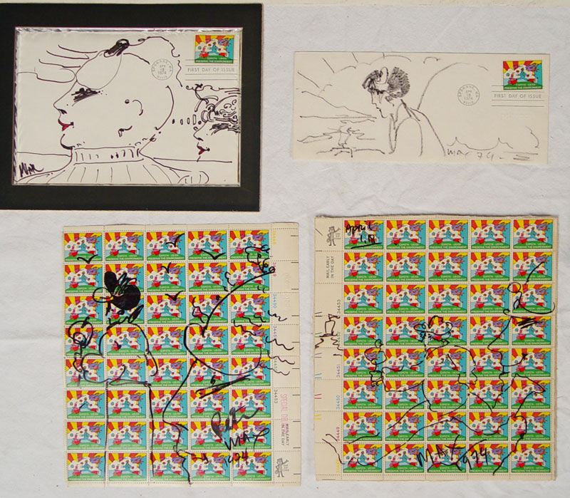 MAX, Peter, (American, 20th Cent.): Signed posters, stamps & original envelope art to include 1) 2 sheet of stamped with original artwork, signed and dated 1974. One sheet affixed to board. 10'' x 8 3/4''. 2) 2 first day cover envelopes with original artworks, signed, one dated '74, other affixed to mat, 8 1/4'' x 9 3/4''. 3) ''It's Icy Orange'' poster signed and dated 1985. 39'' x 25 3/4'' 4) 1986 California Art Expo, signed and dated 1986. 29'' x 22 3/4''.