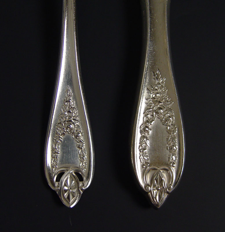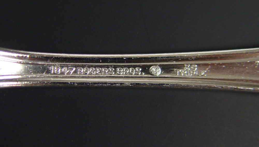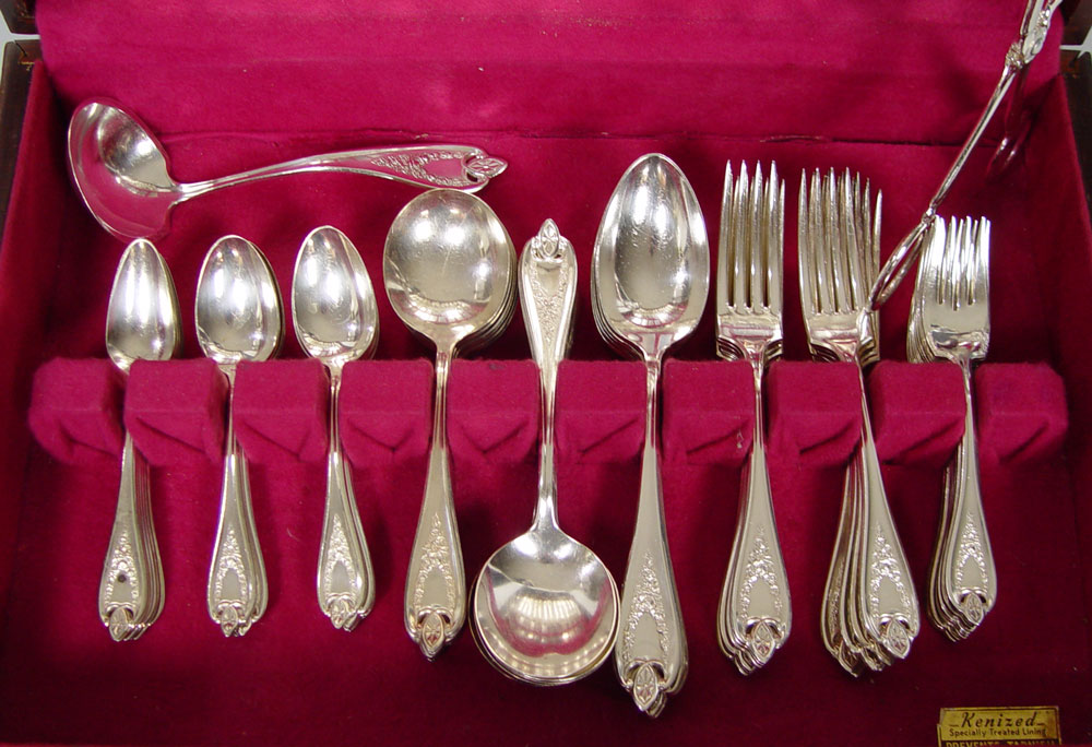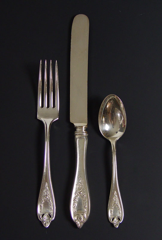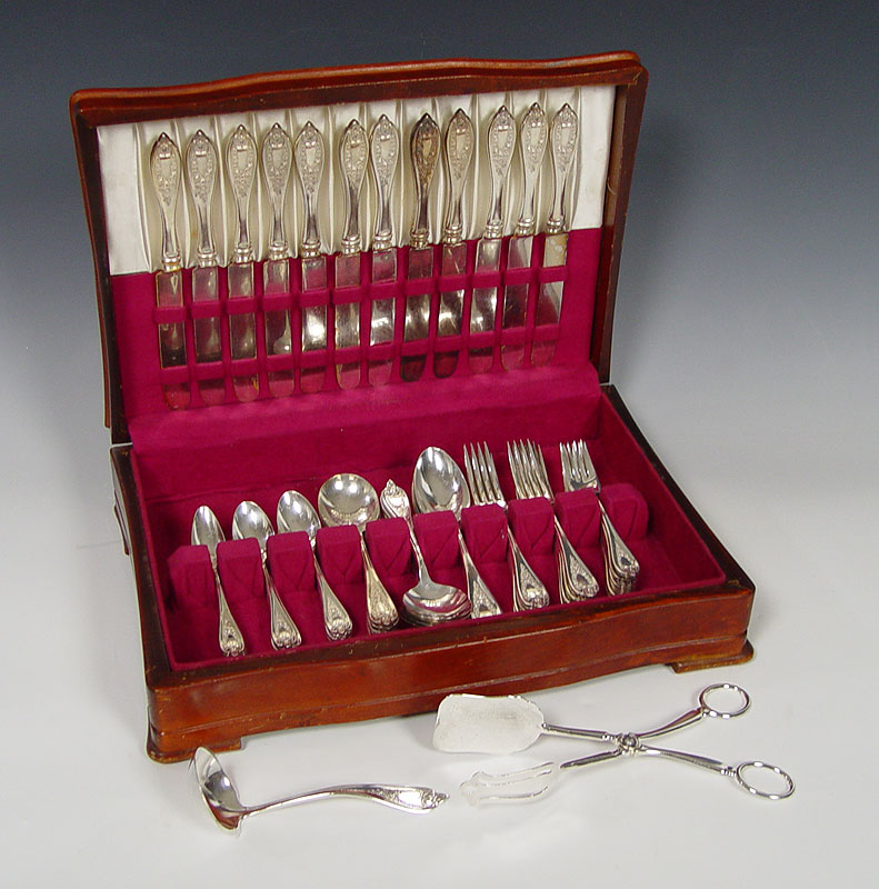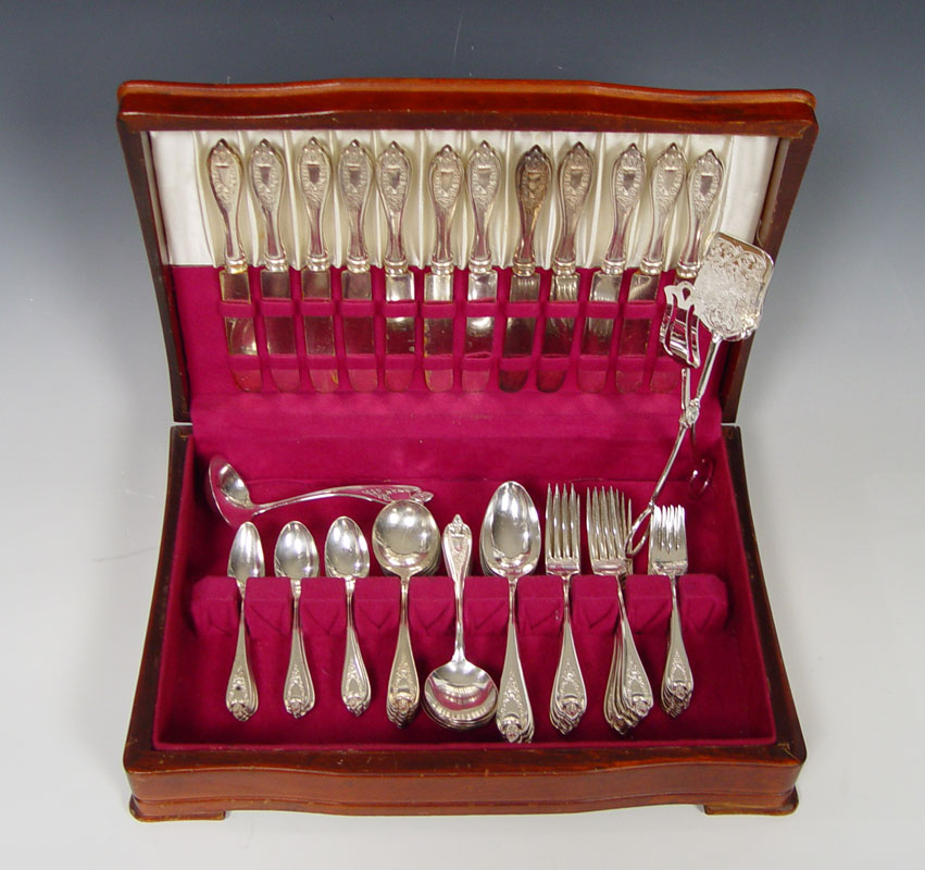 ROGERS BROS. 1847 ''OLD COLONY'' FLATWARE SERVICE: Silver plate service for twelve to include, Old French hollow handle knives with bolster, dinner forks, salad forks, round bowl soup spoons, 17 teaspoons, 5 table spoons, and a gravy ladle. Sold in wooden storage box with Italian silver plate tong server.