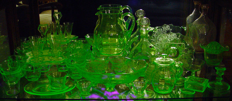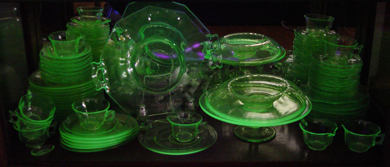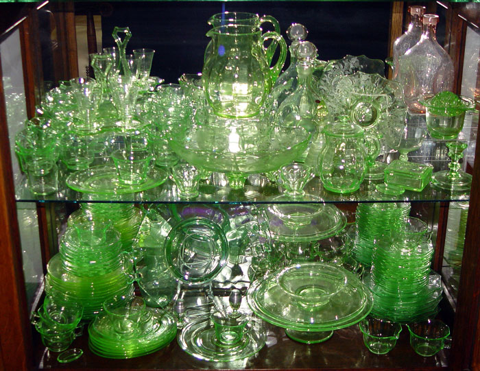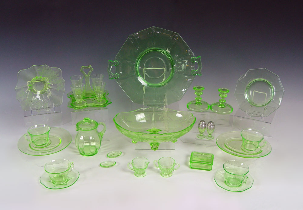 LARGE LOT ELEGANT GREEN DEPRESSION GLASS - MOST SIGNED CAMBRIDGE: Over 100 pieces to include but not limited to large banana bowl, decanter, water pitcher, small pitcher with cover, 15'' handled serving plate, small salt and pepper, 4 plates (7 3/4''), 10 plates (8 1/2''), cake pedestal, 25 saucers in 3 shapes, 29 assorted cups, 6 round tea and toast plates, 6 oval tea and toast plates, 4 juice glasses on stand, candle holder, and card box. Most bear the Cambridge mark.